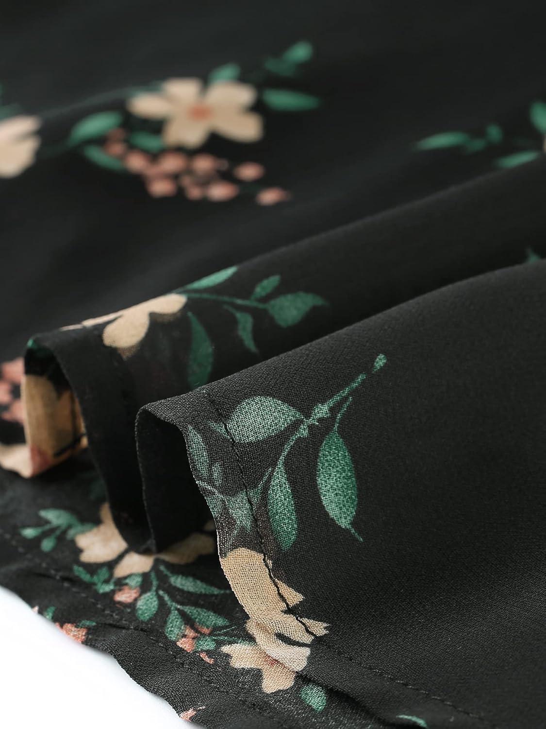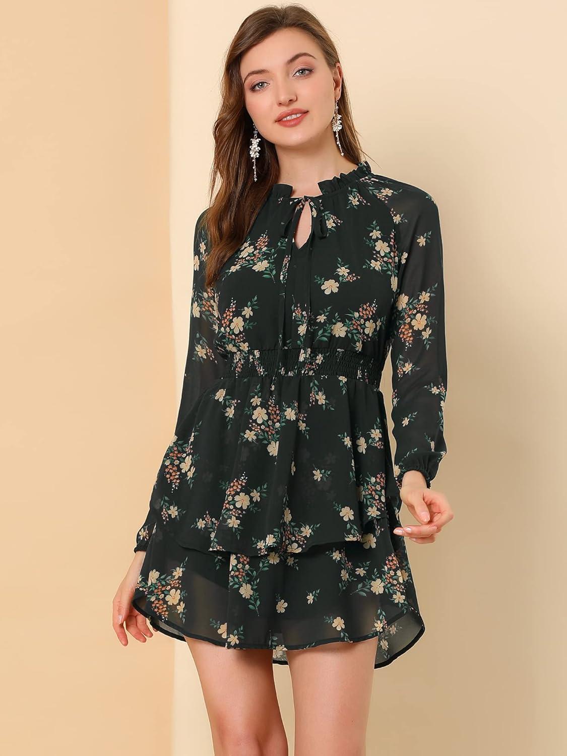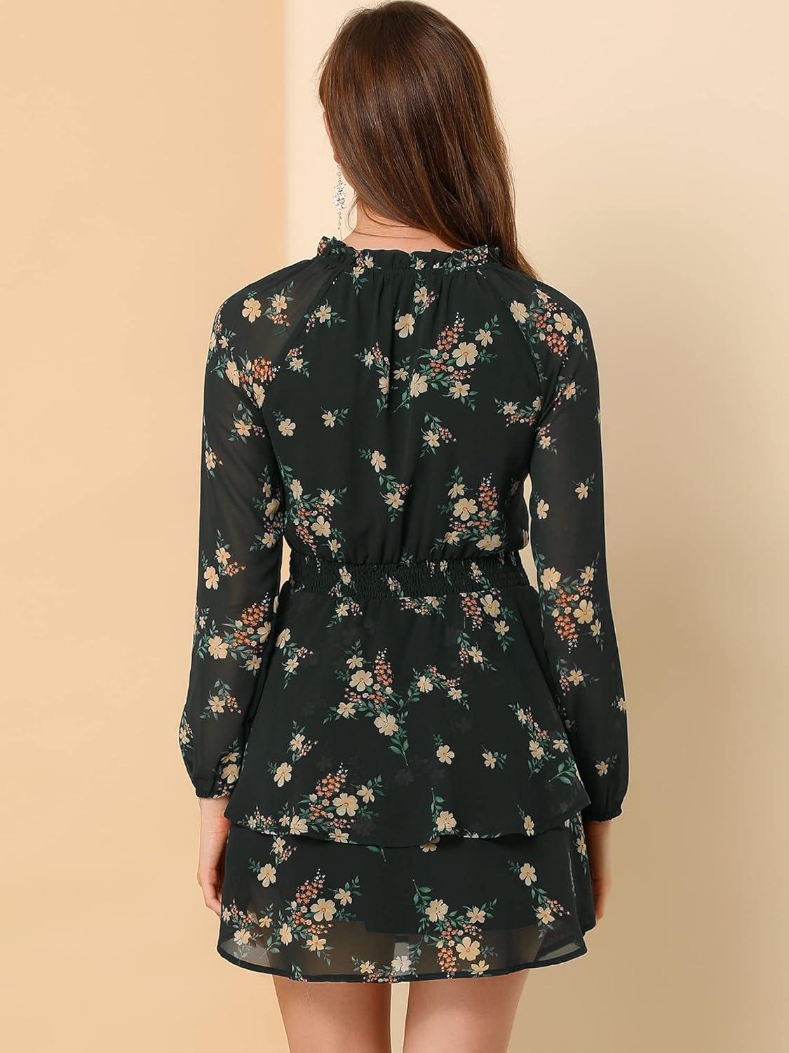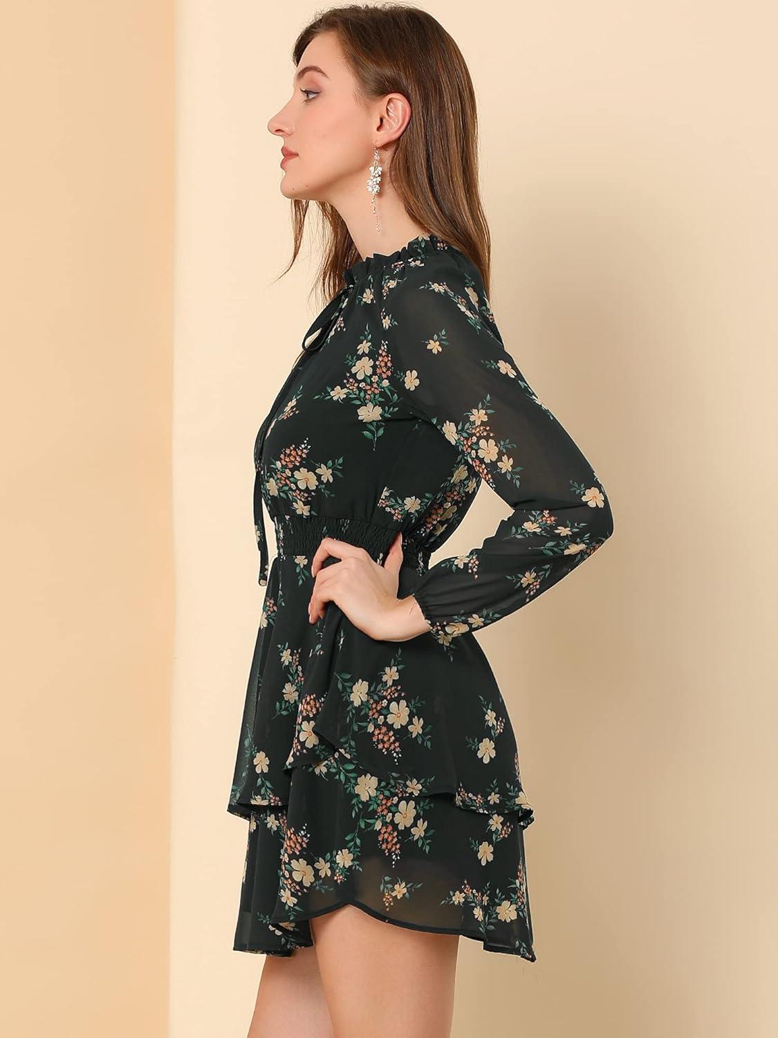Allegra K Women’s Ruffled Floral Smocked Waist Layered Tiered Chiffon Dress(Black Brown)