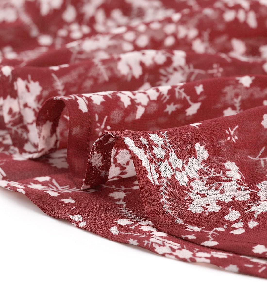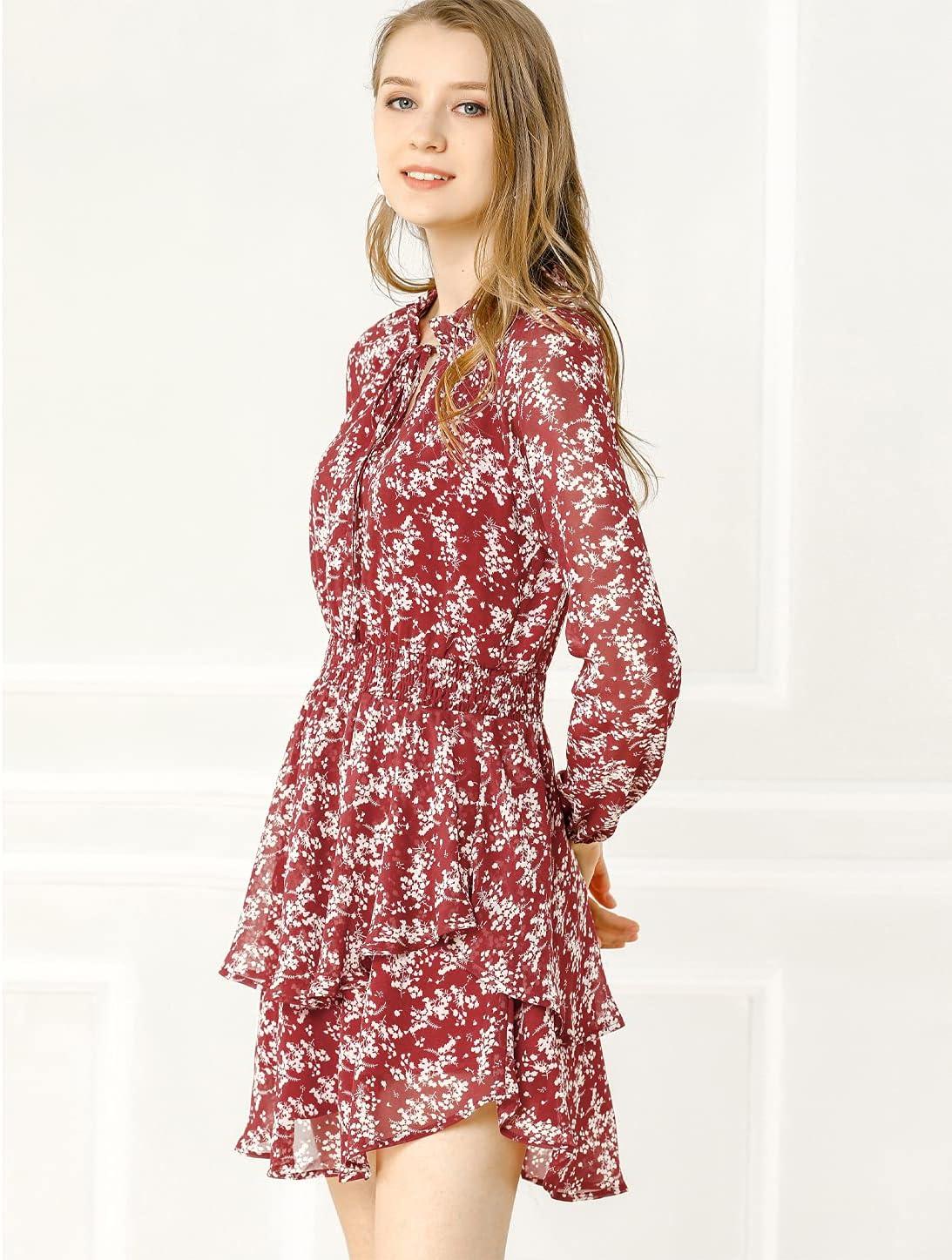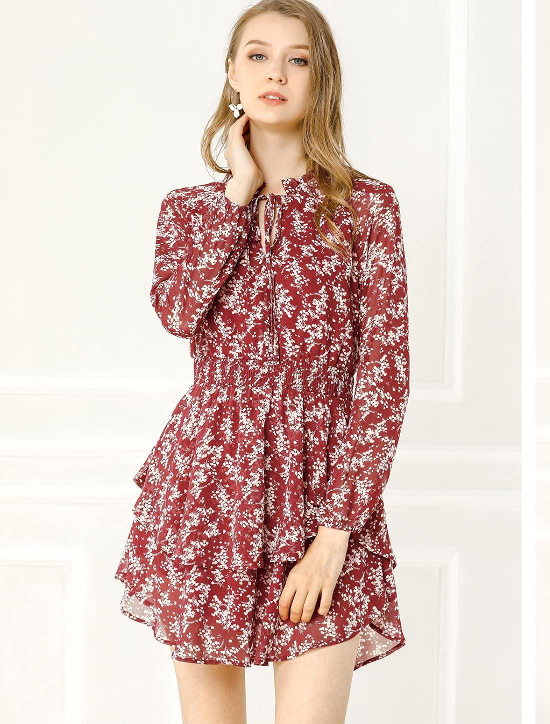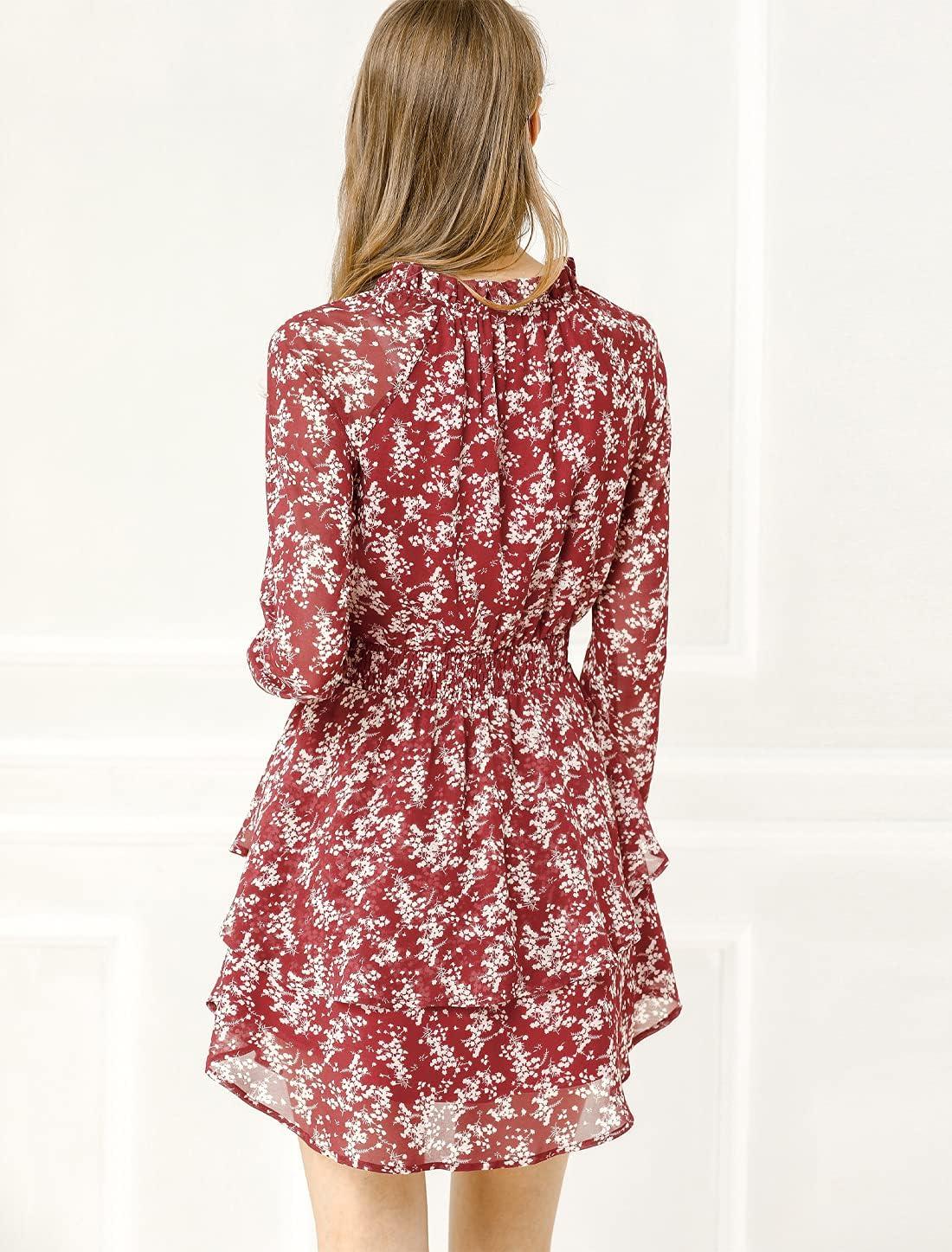 Allegra K Women’s Ruffled Floral Smocked Waist Layered Tiered Chiffon Dress(Wine Red)