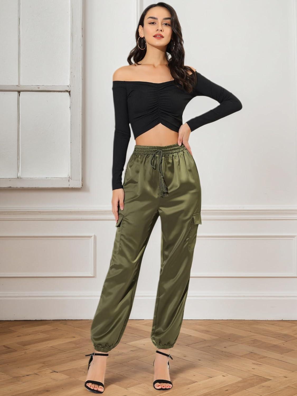 Get more for your money with our exclusive bundle deals on Allegra K Women’s Satin Pants Tie Elastic High Waist Shiny Silky Dressy Satin Cargo Joggers(Green) and accessories.