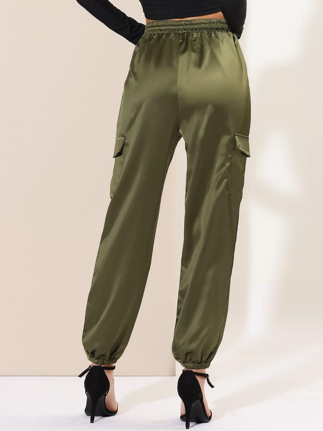 Allegra K Women’s Satin Pants Tie Elastic High Waist Shiny Silky Dressy Satin Cargo Joggers(Green)