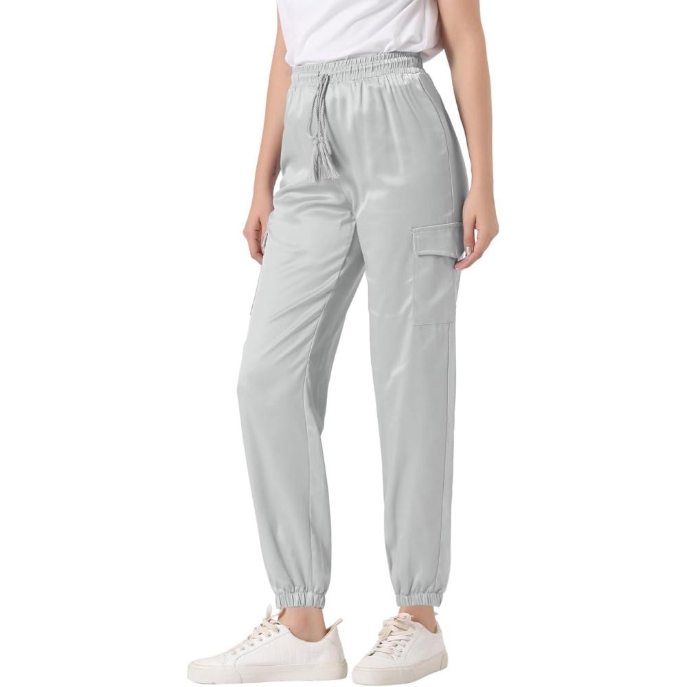 Allegra K Women’s Satin Pants Tie Elastic High Waist Shiny Silky Dressy Satin Cargo Joggers(Grey)