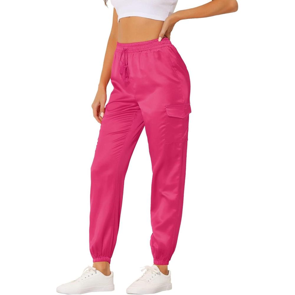 Allegra K Women’s Satin Pants Tie Elastic High Waist Shiny Silky Dressy Satin Cargo Joggers(Rose Red)