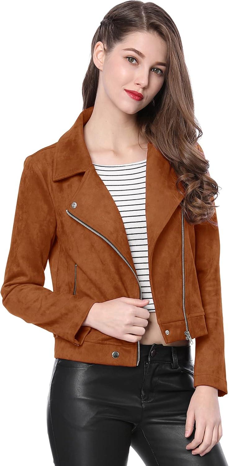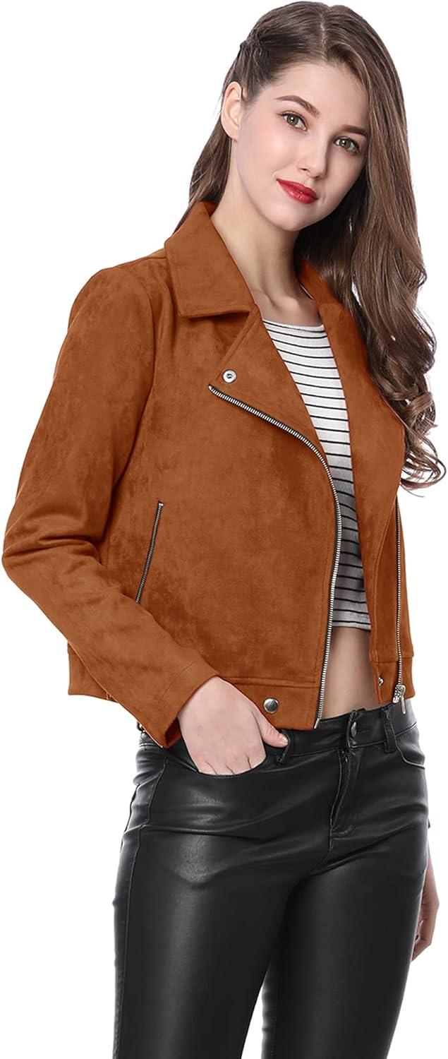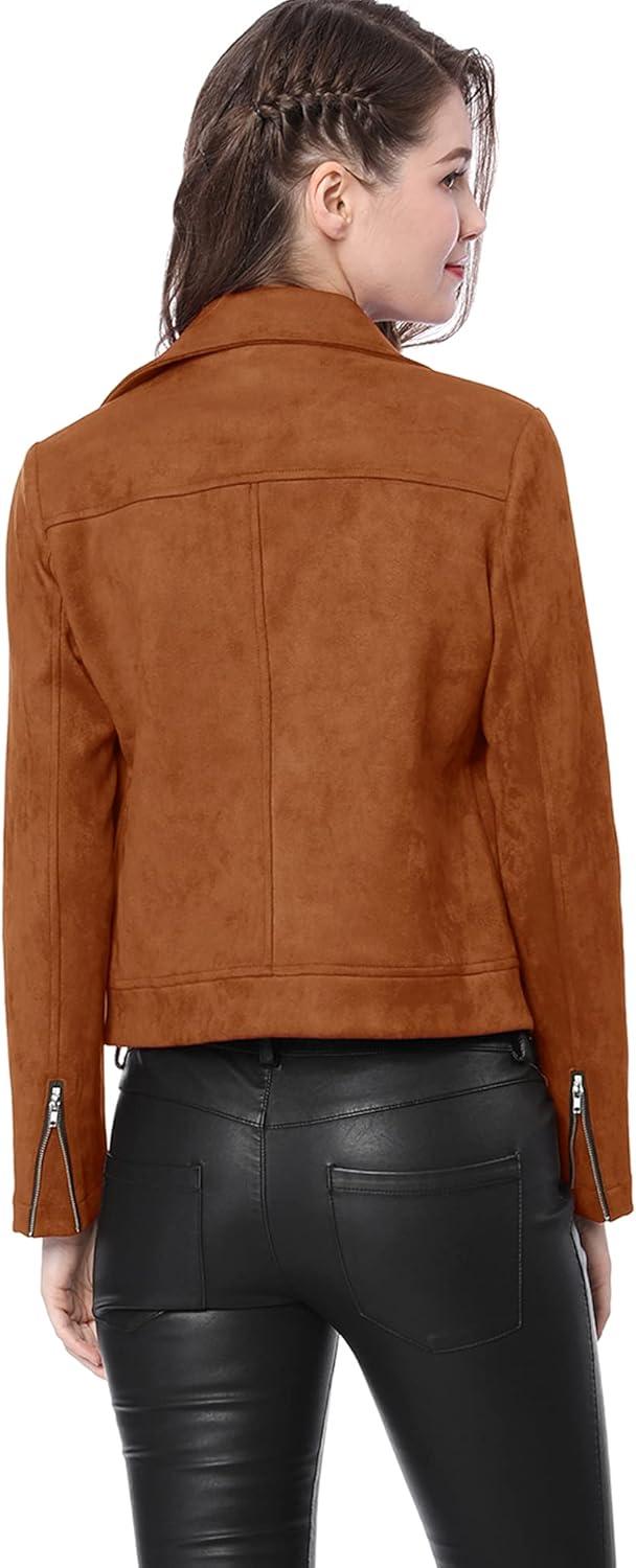 Allegra K Women’s Short Soft Zip Up Faux Suede Biker Moto Jacket(Brown)