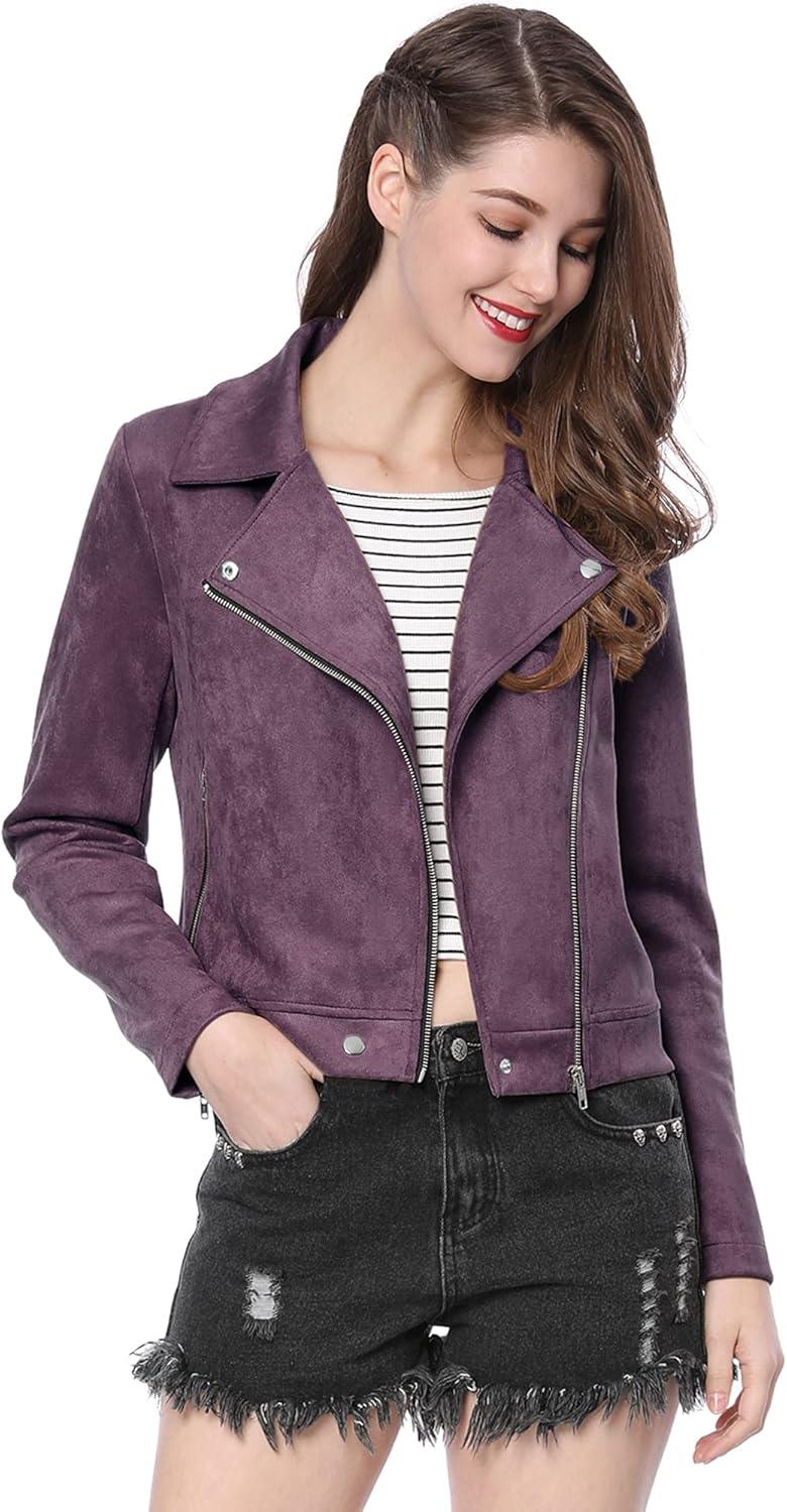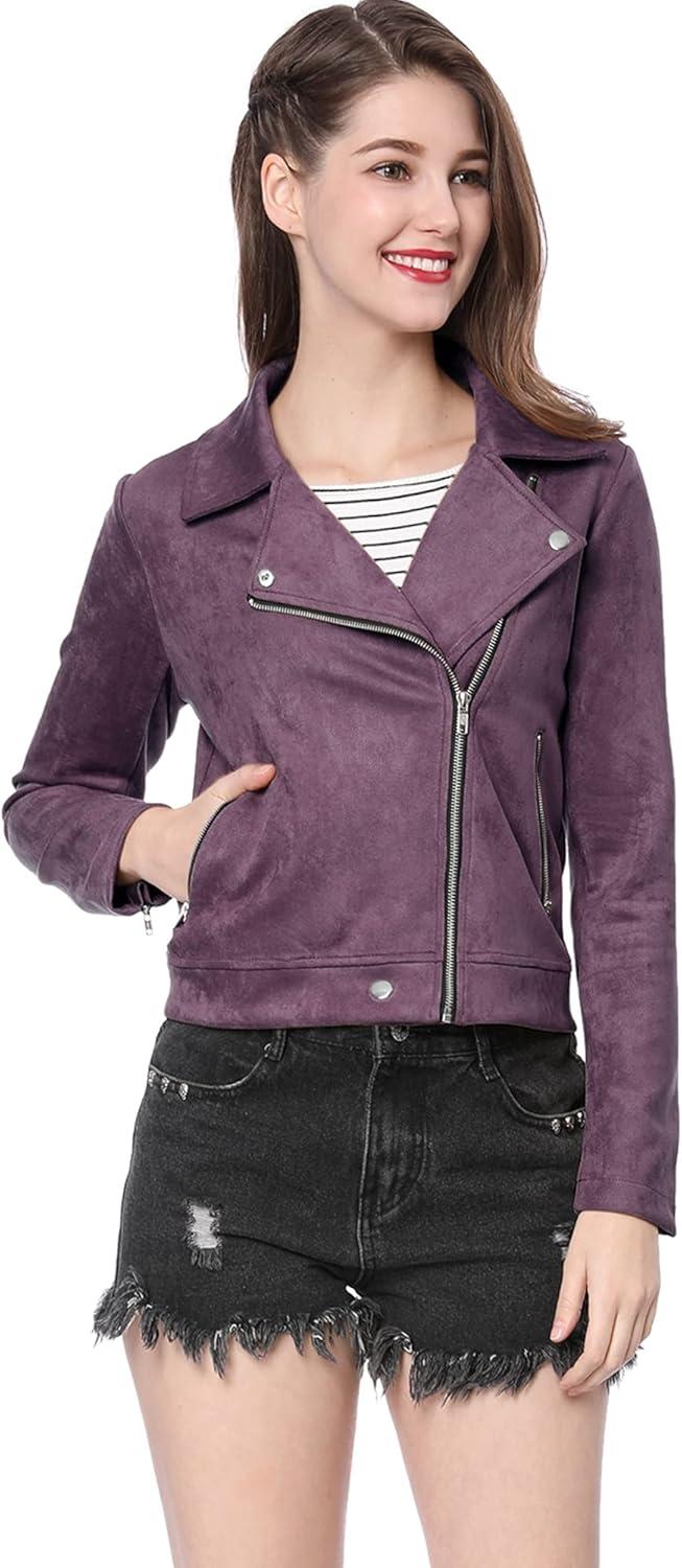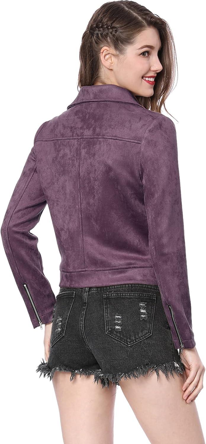 Allegra K Women's Short Soft Zip Up Faux Suede Biker Moto Jacket(Dark Purple)