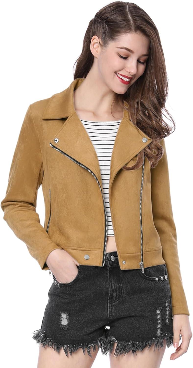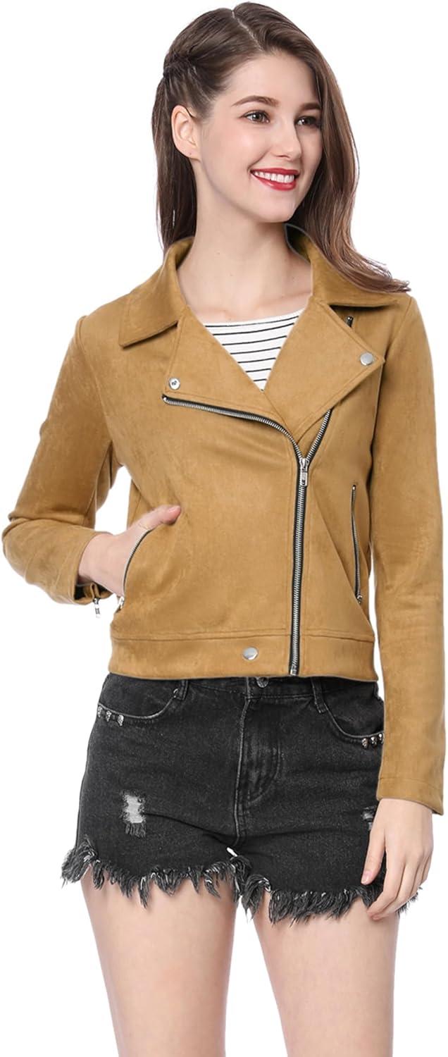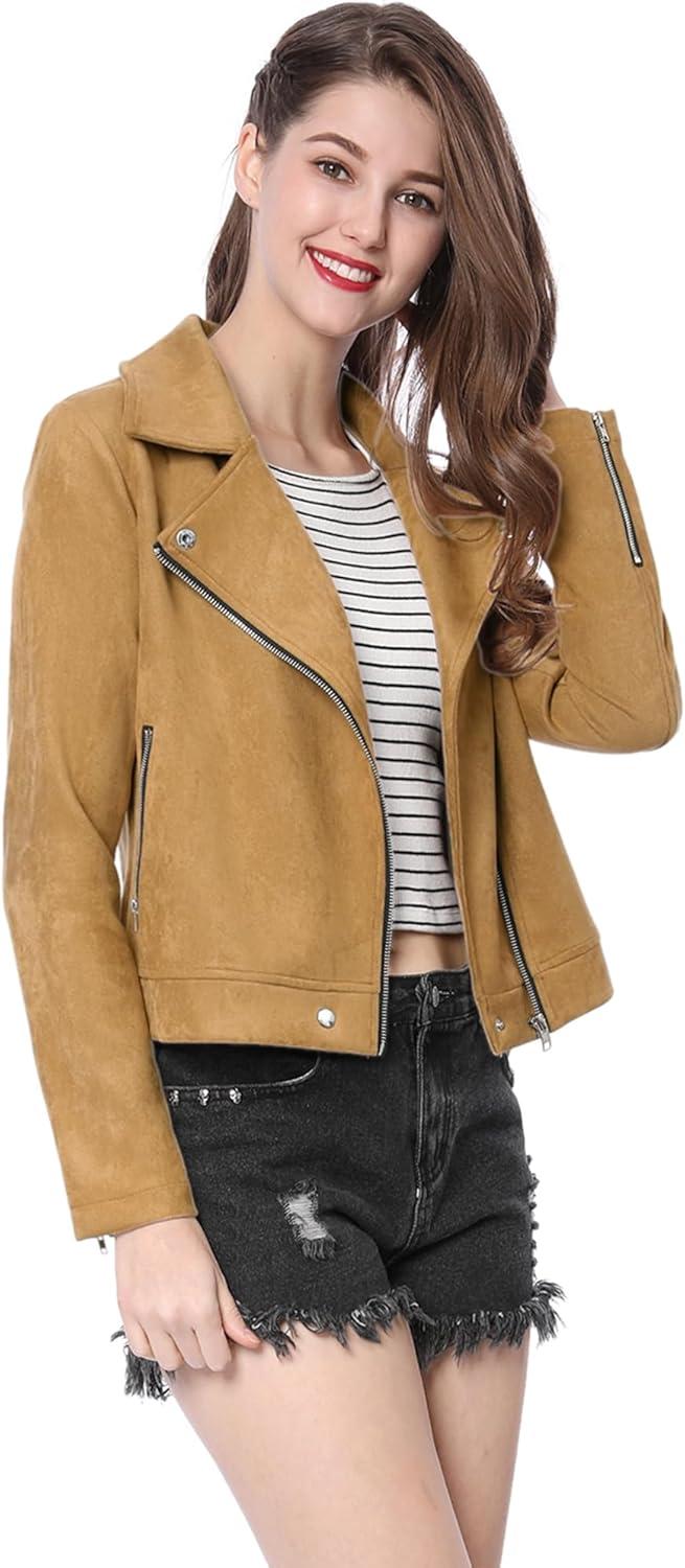 Allegra K Women’s Short Soft Zip Up Faux Suede Biker Moto Jacket(Khaki)