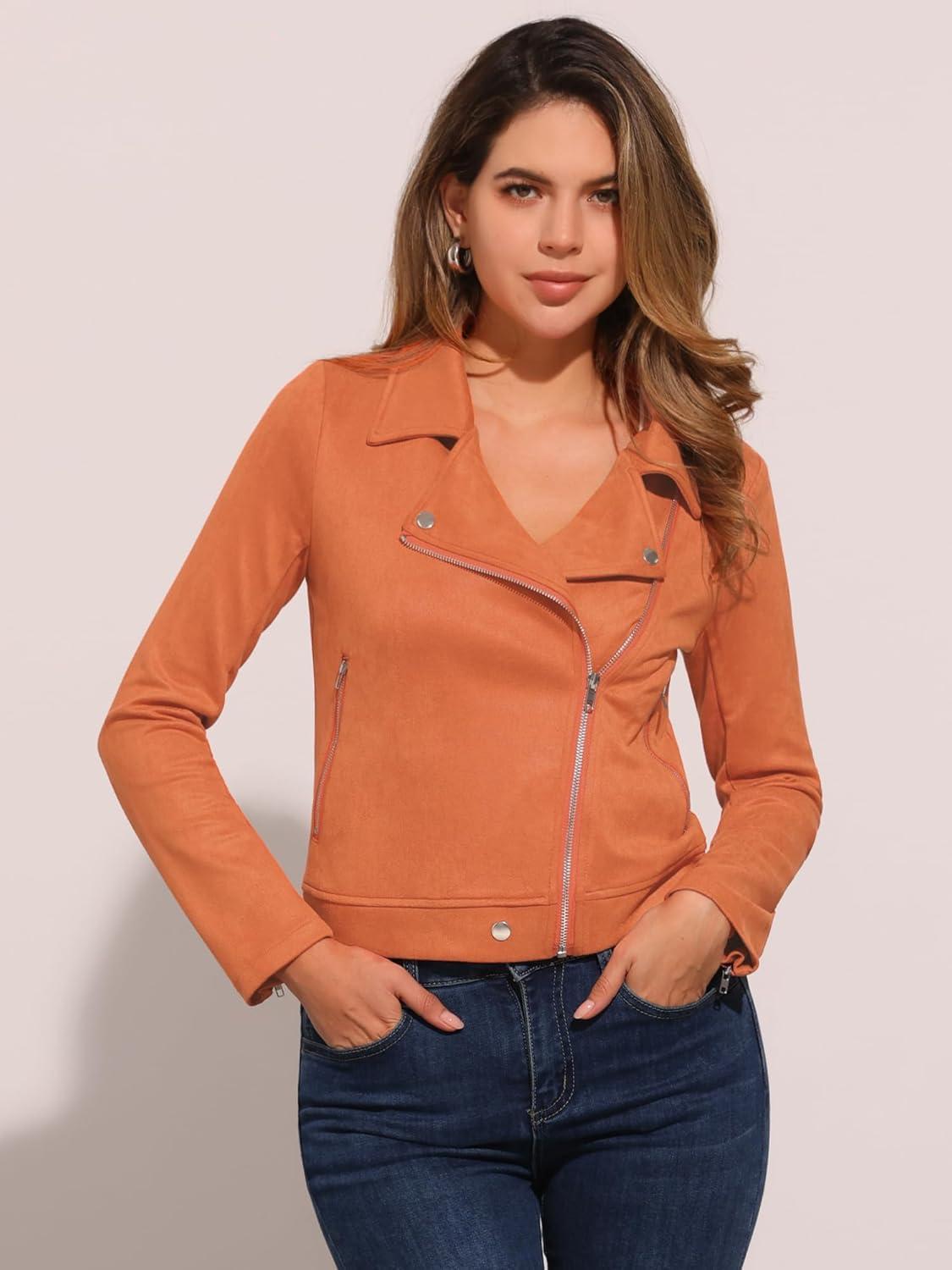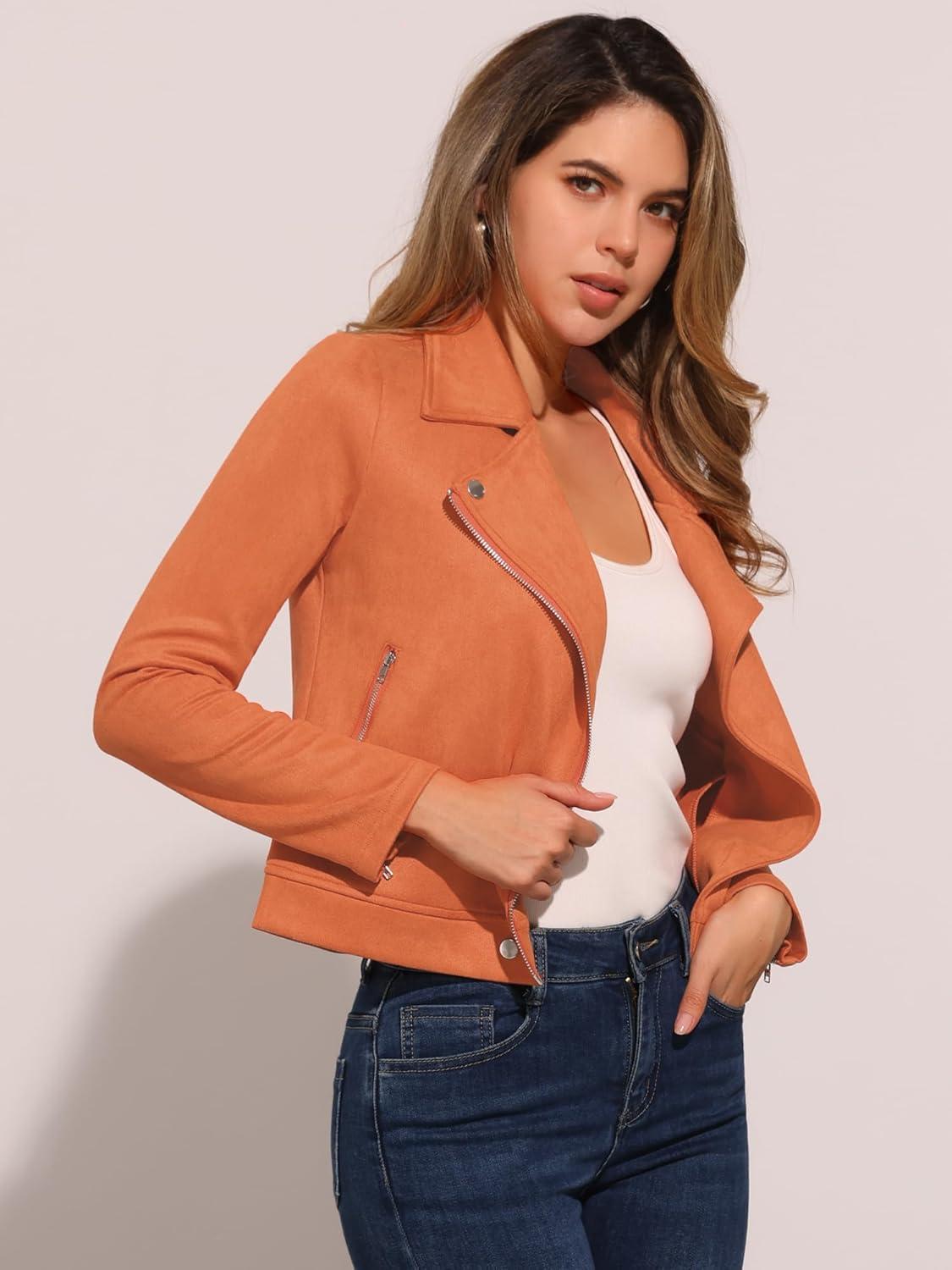 Allegra K Women’s Short Soft Zip Up Faux Suede Biker Moto Jacket(Orange)