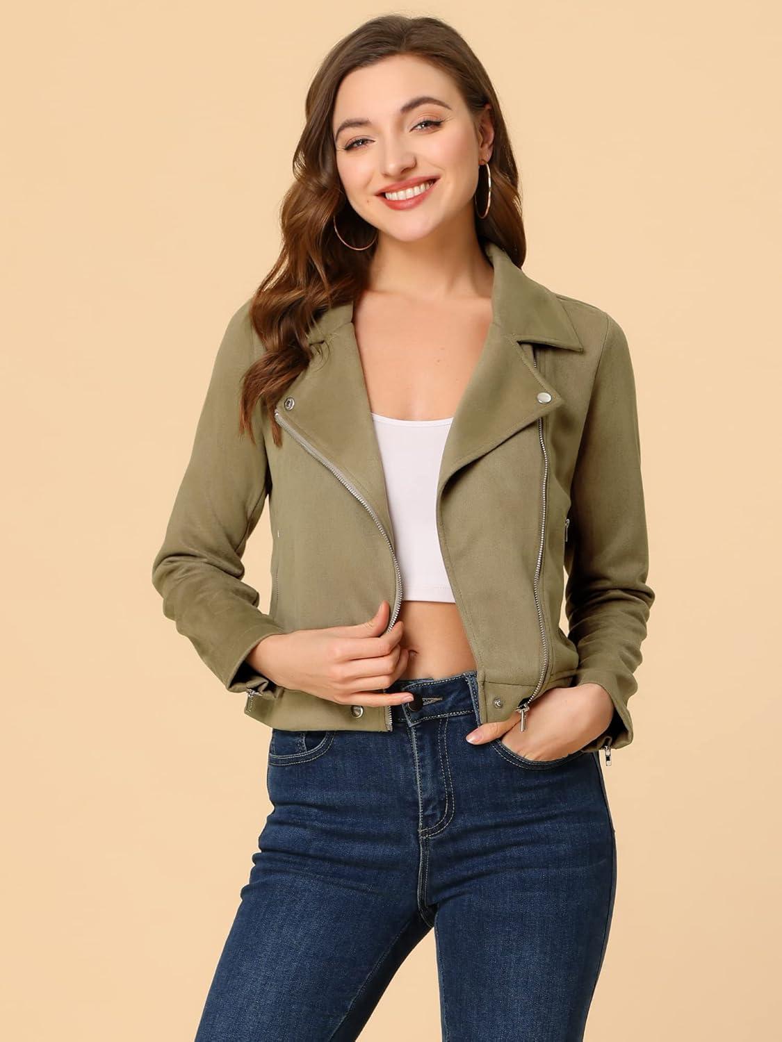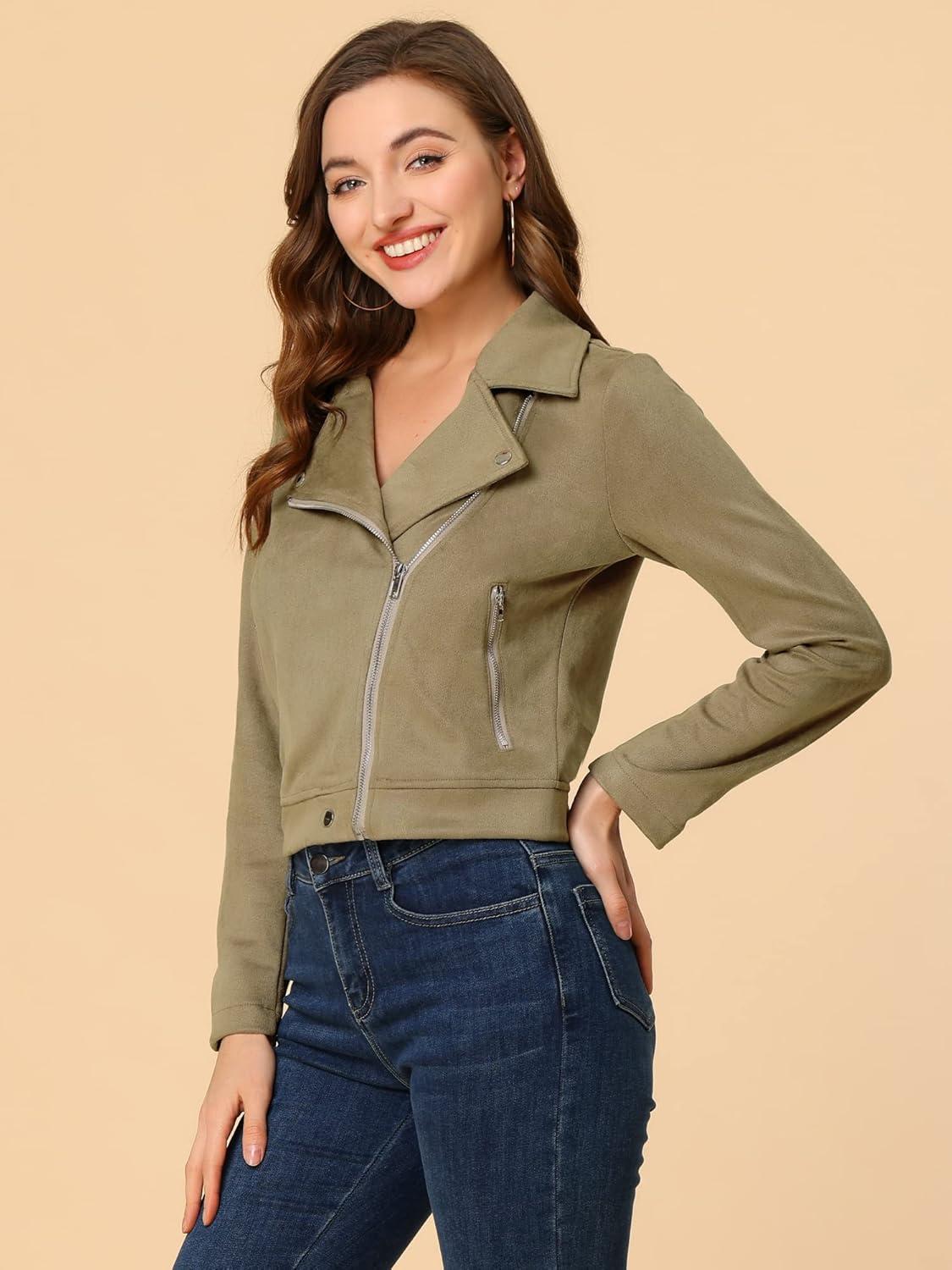 Allegra K Women’s Short Soft Zip Up Faux Suede Biker Moto Jacket(Light Khaki)