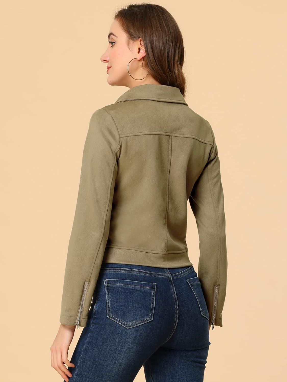 Allegra K Women's Short Soft Zip Up Faux Suede Biker Moto Jacket(Pale Khaki)