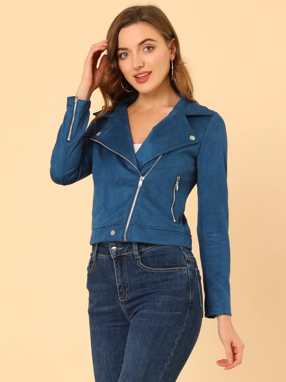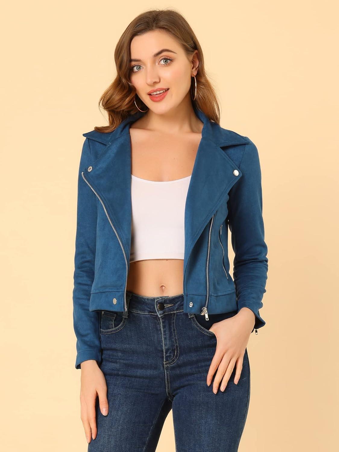 Allegra K Women’s Short Soft Zip Up Faux Suede Biker Moto Jacket(Royal Blue)
