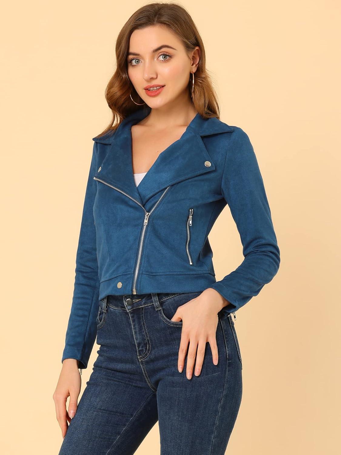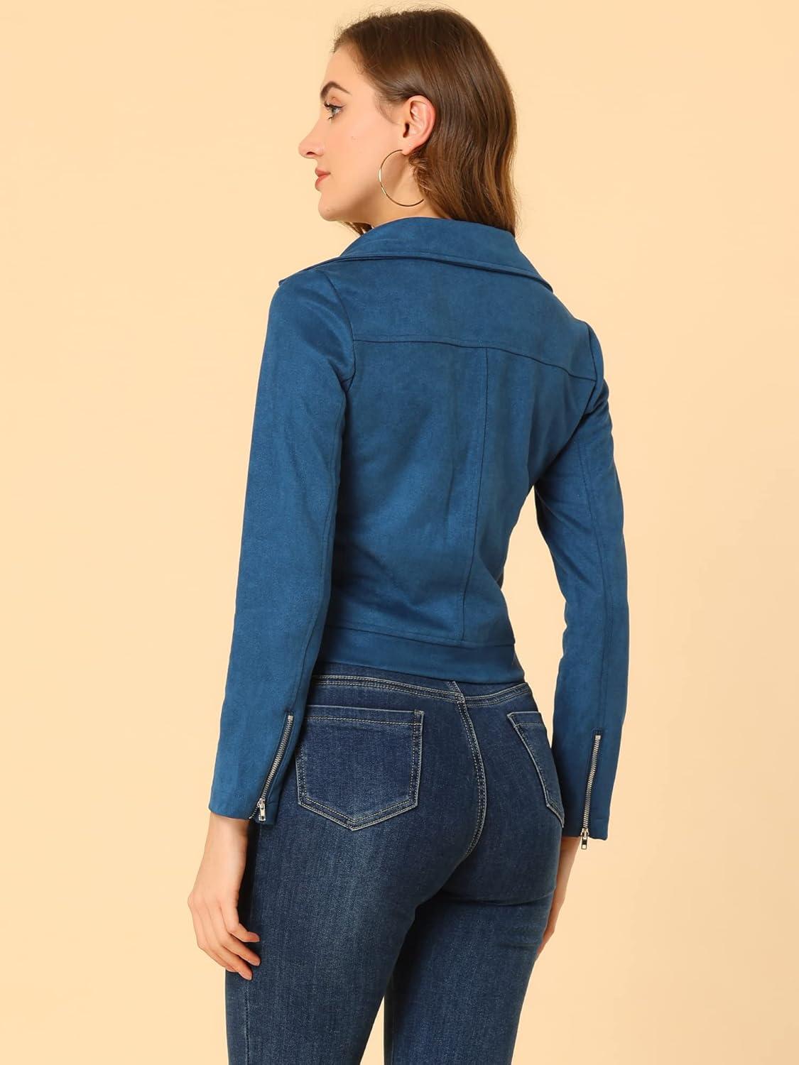 Allegra K Women's Short Soft Zip Up Faux Suede Biker Moto Jacket(Royal Blue)