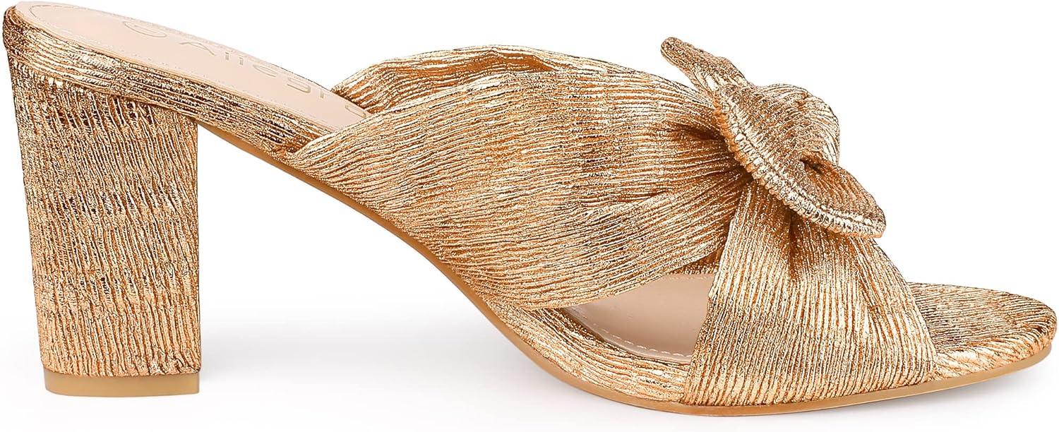 Allegra K Women’s Slip on Pleated Bow Heels Chunky Heel Slouches Slides Sandals(Colorful Silver)