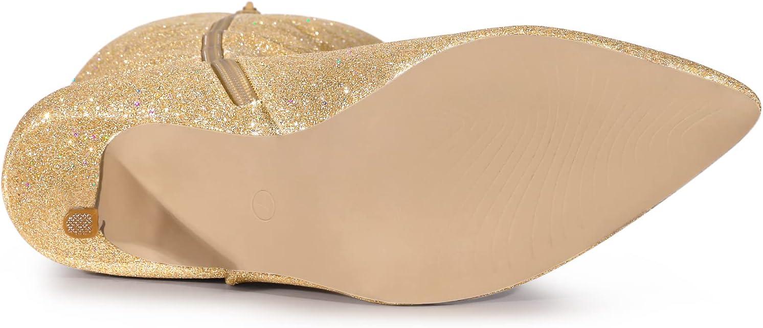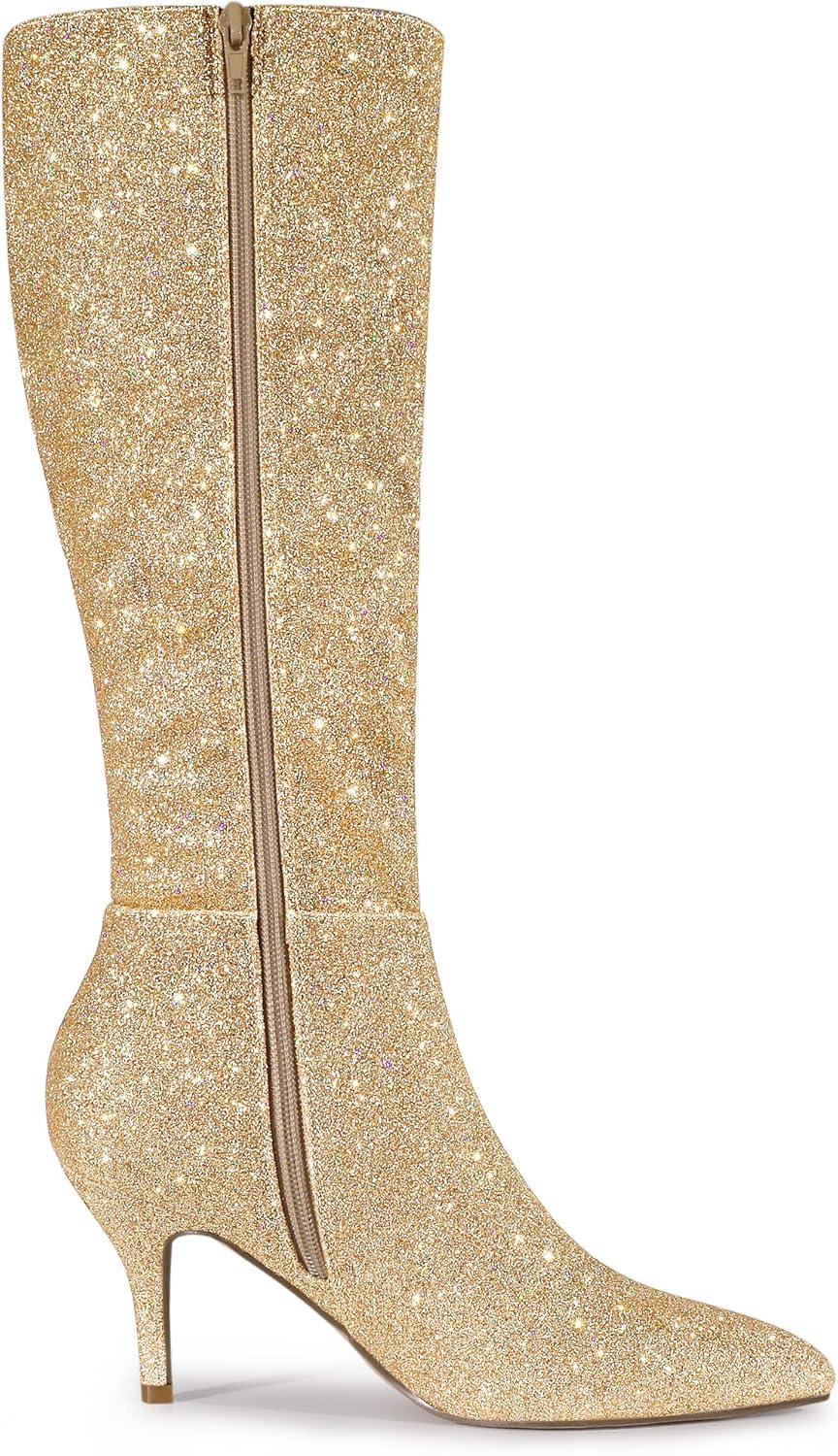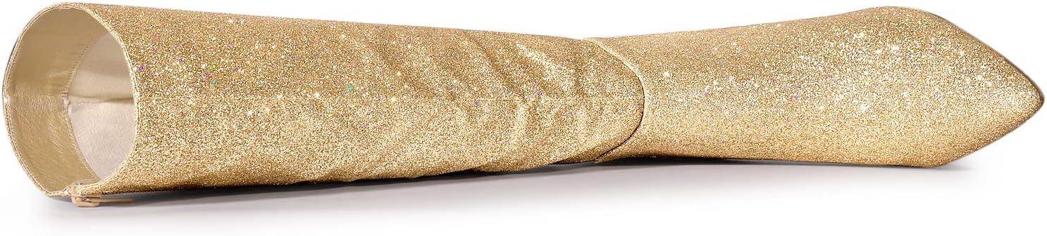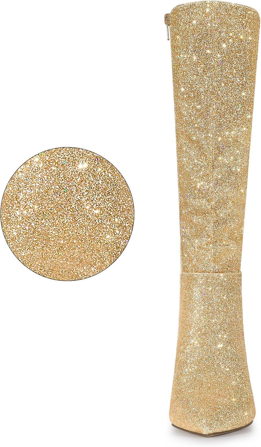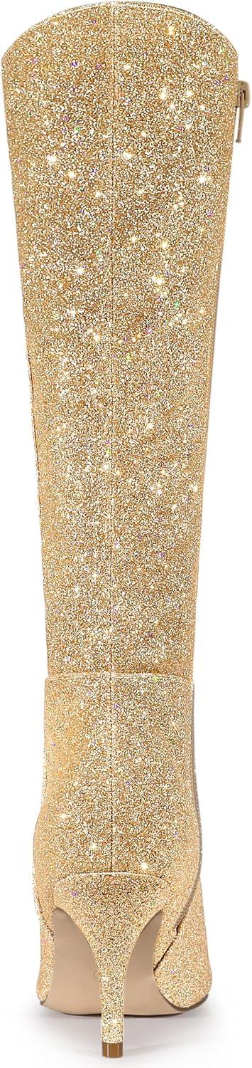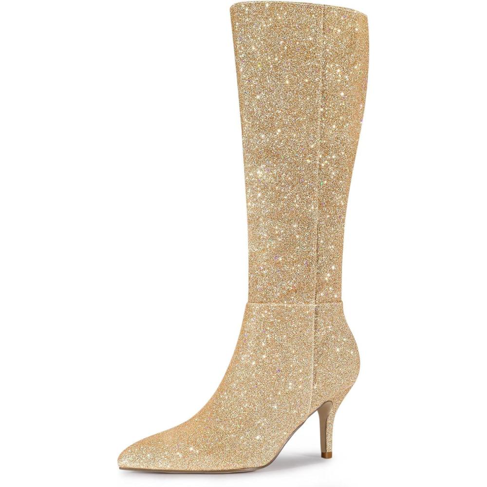 Allegra K Women’s Sparkle Glitter Pointy Toe Stiletto Heel Knee High Boots(Gold)