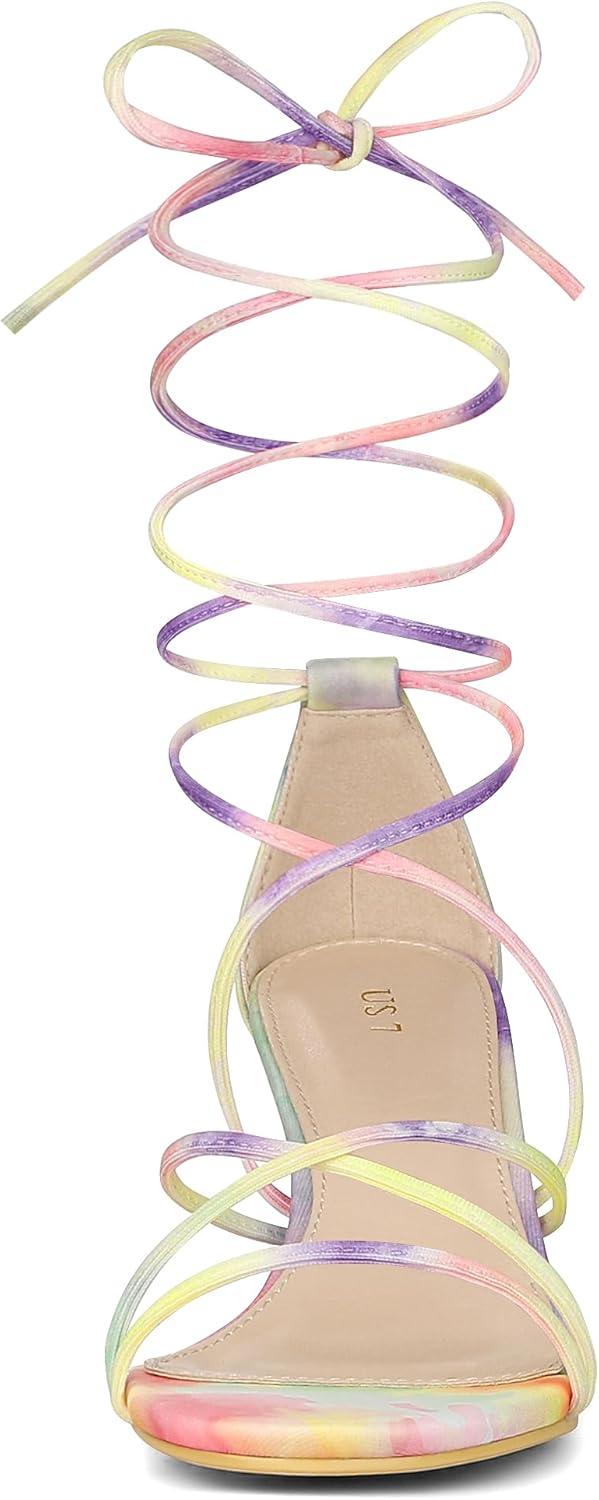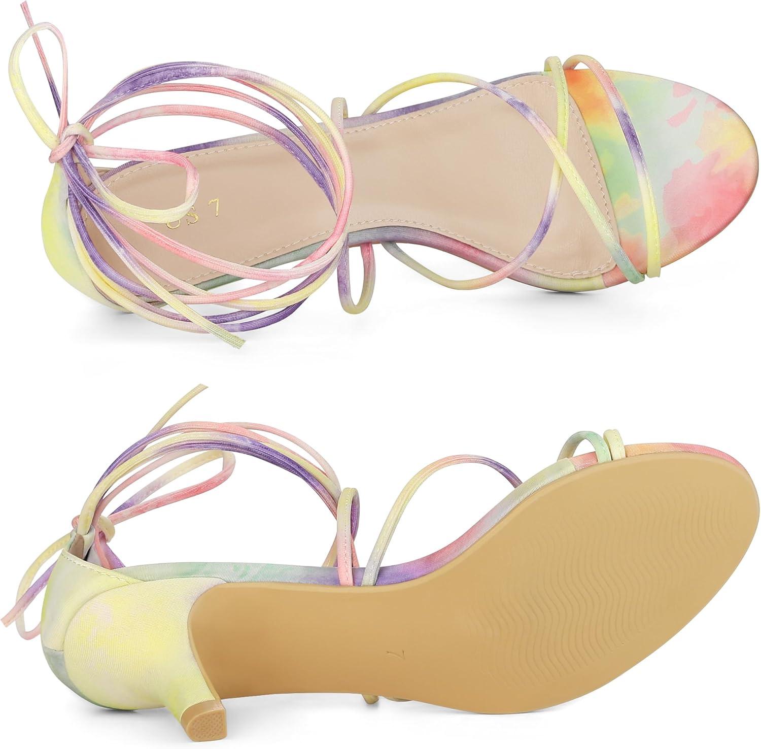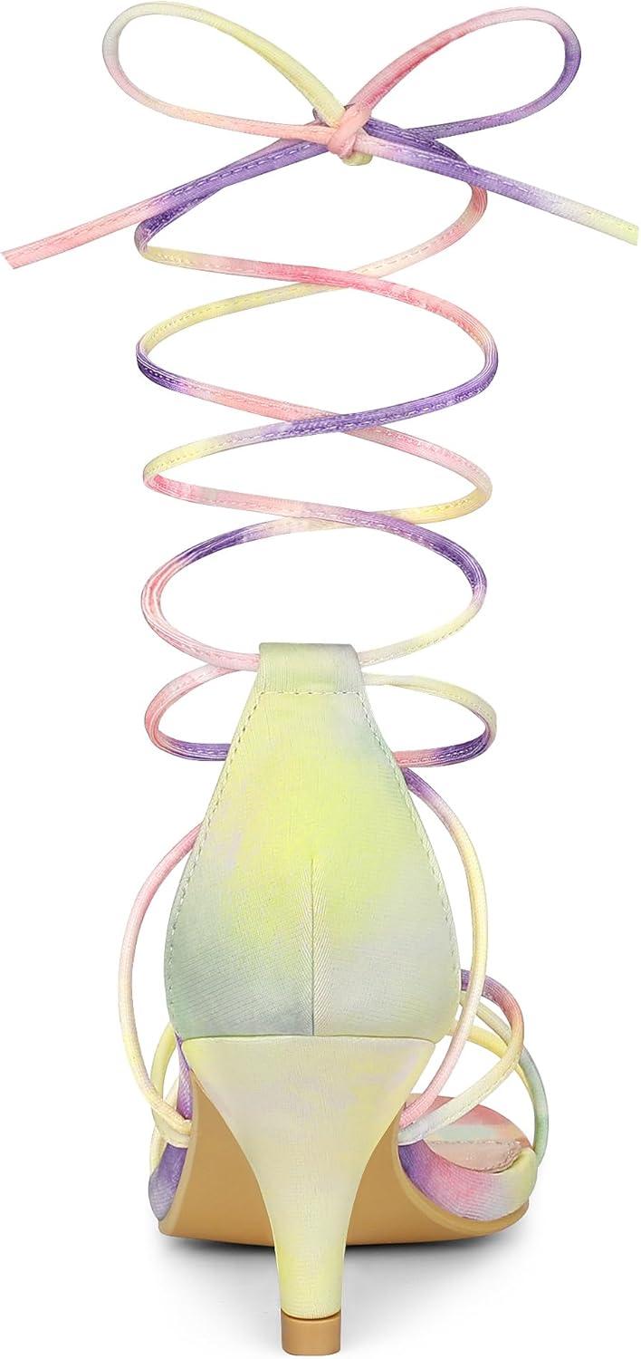 Allegra K Women’s Strappy Tie Dye Heels Lace Up Kitten Heel Sandals(Yellow)
