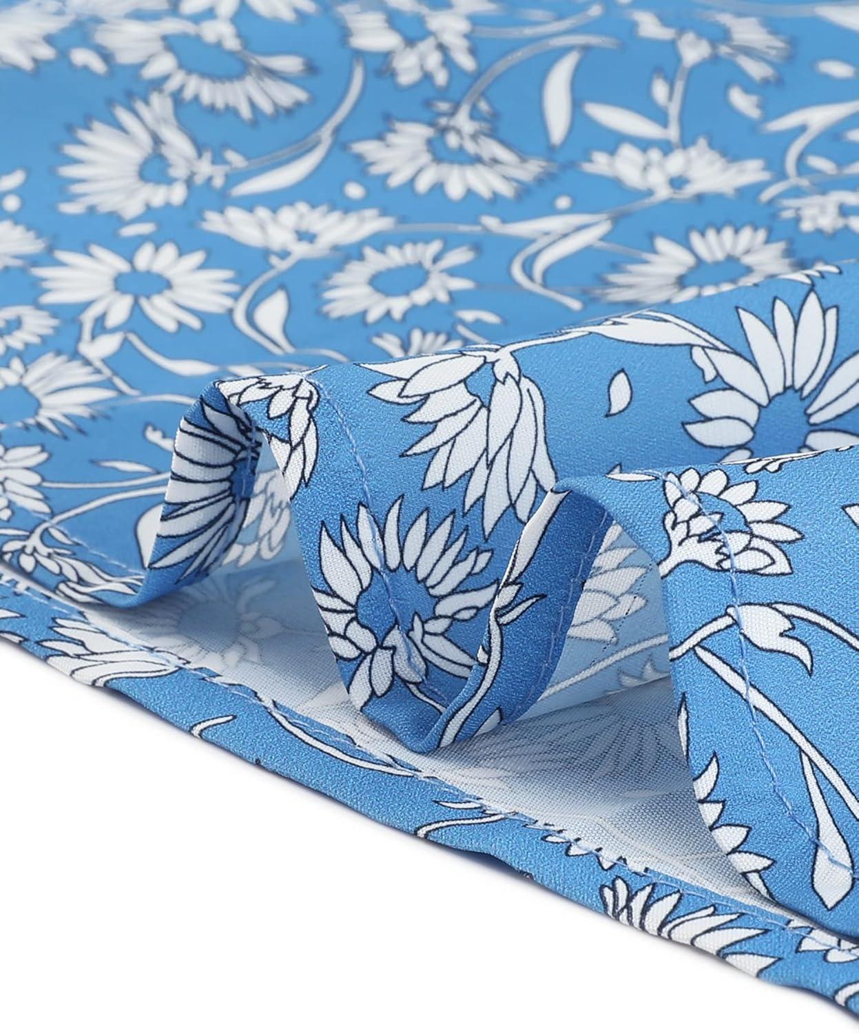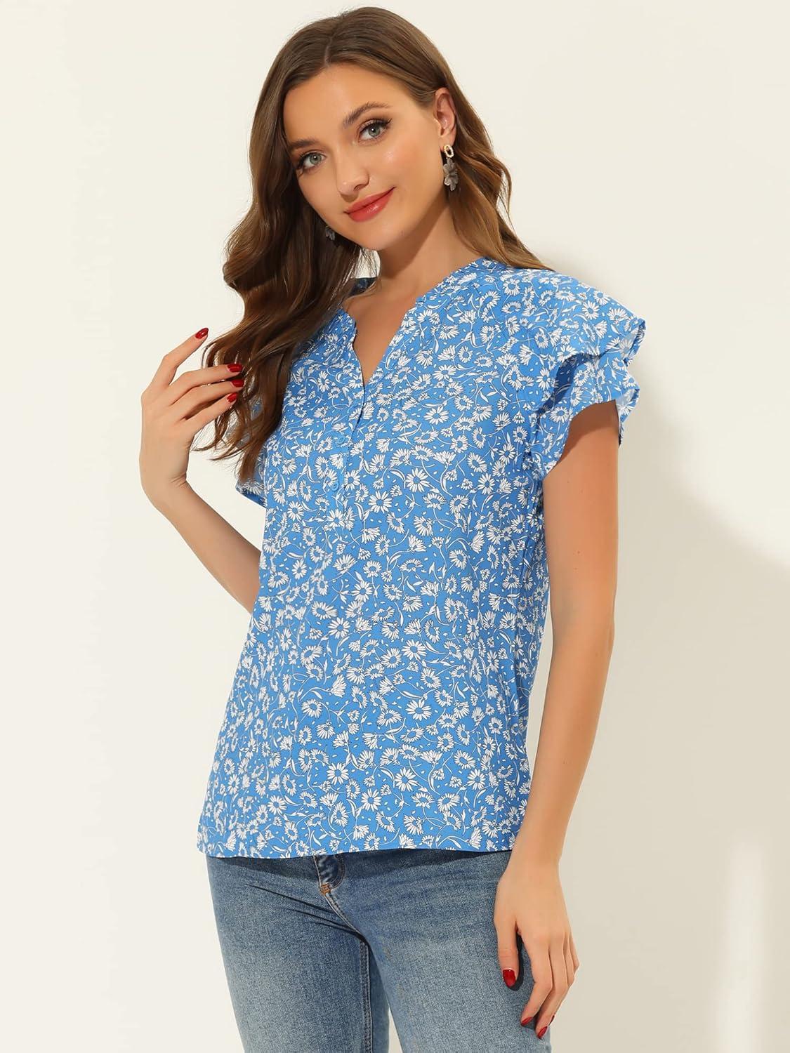 Allegra K Women’s Summer Floral Blouse Button V Neck Ruffled Cap Short Sleeve Casual Peasant Top(Blue)