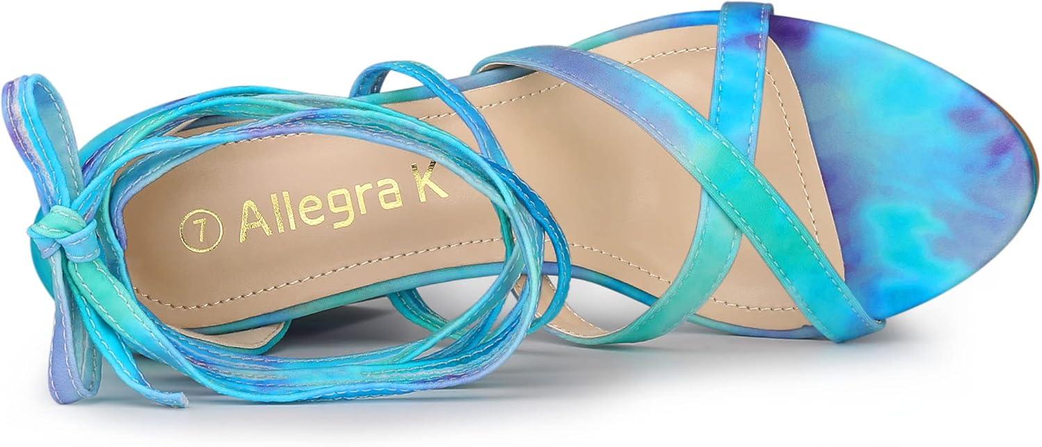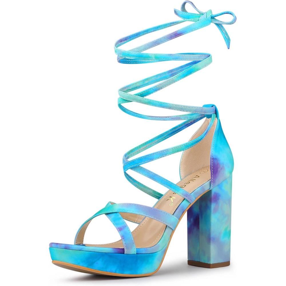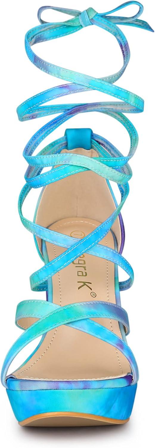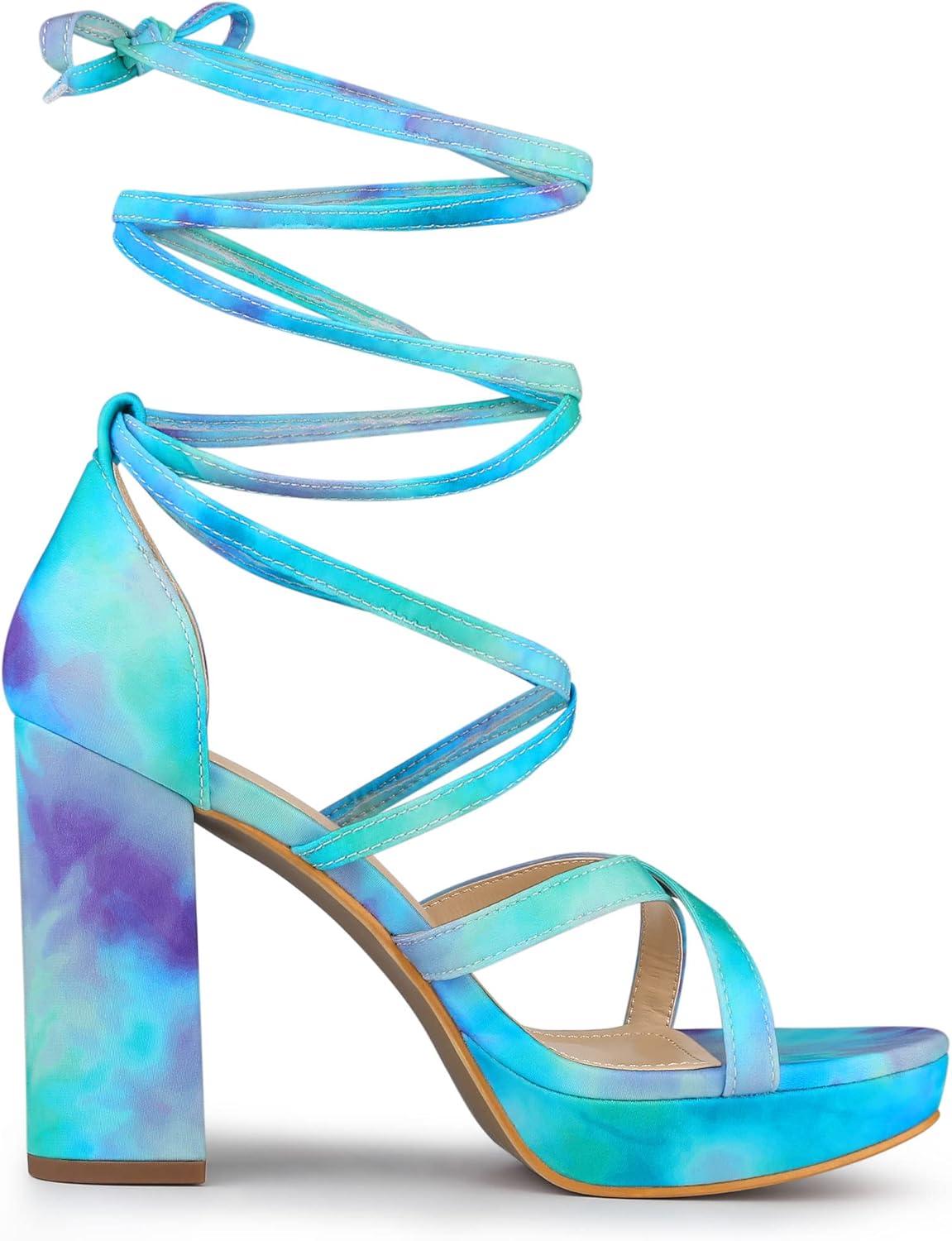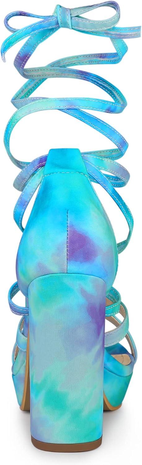 Allegra K Women’s Tie Dye Platform Chunky Heel Lace Up Sandals(Cyan)