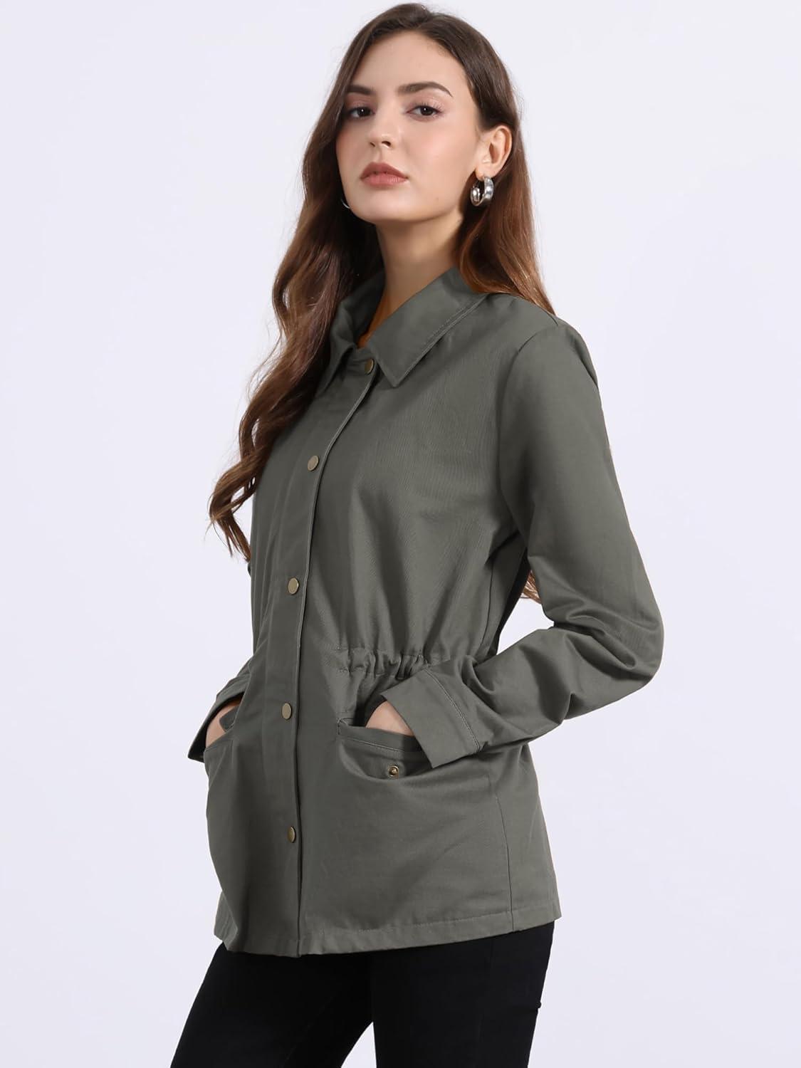 Allegra K Women’s Utility Jacket Zip Up Drawstring Waist Snap Buttons Lightweight Anorak Jackets with Pockets(Green)
