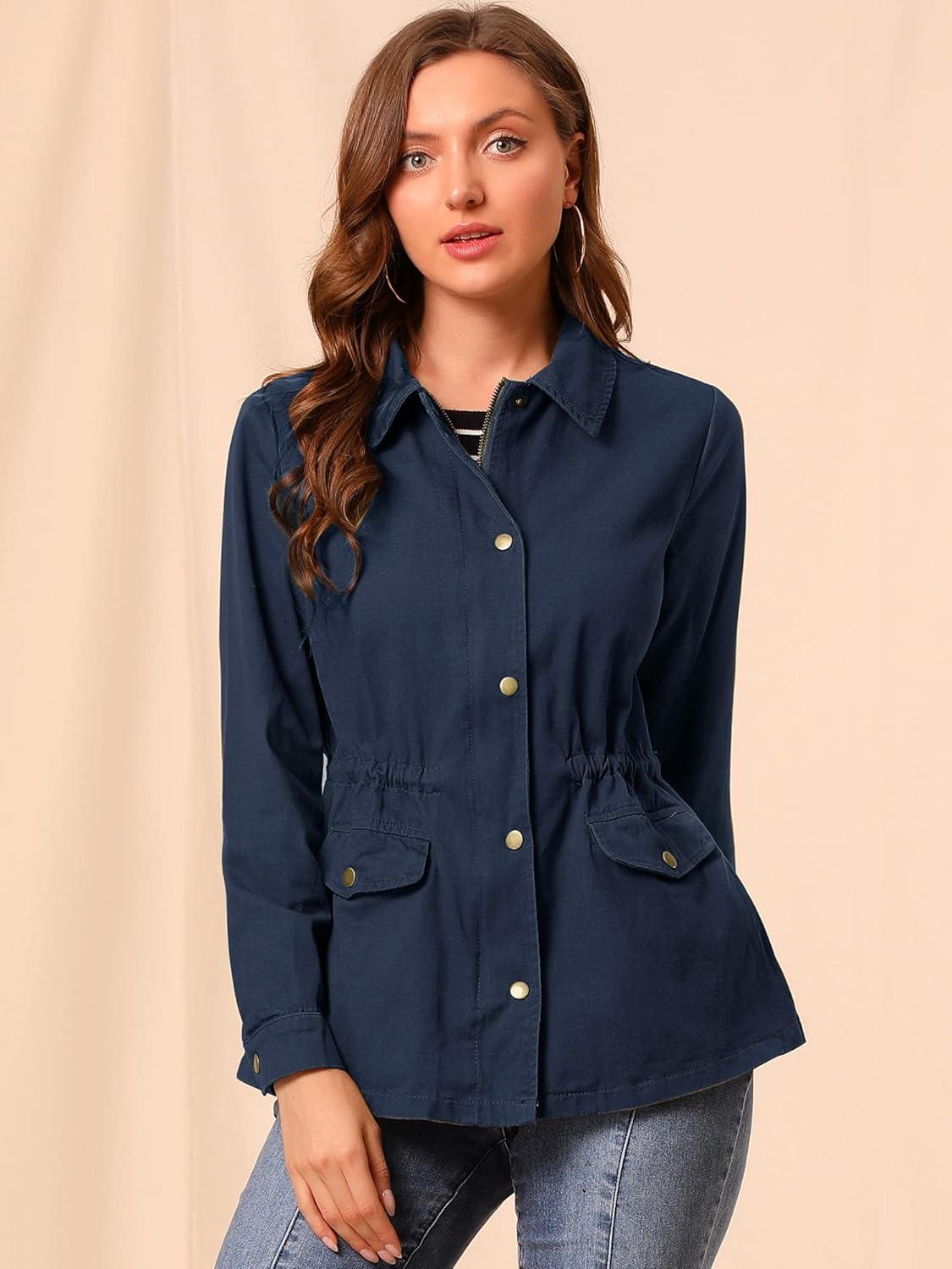 Allegra K Women’s Utility Jacket Zip Up Drawstring Waist Snap Buttons Lightweight Anorak Jackets with Pockets(Navy Blue)