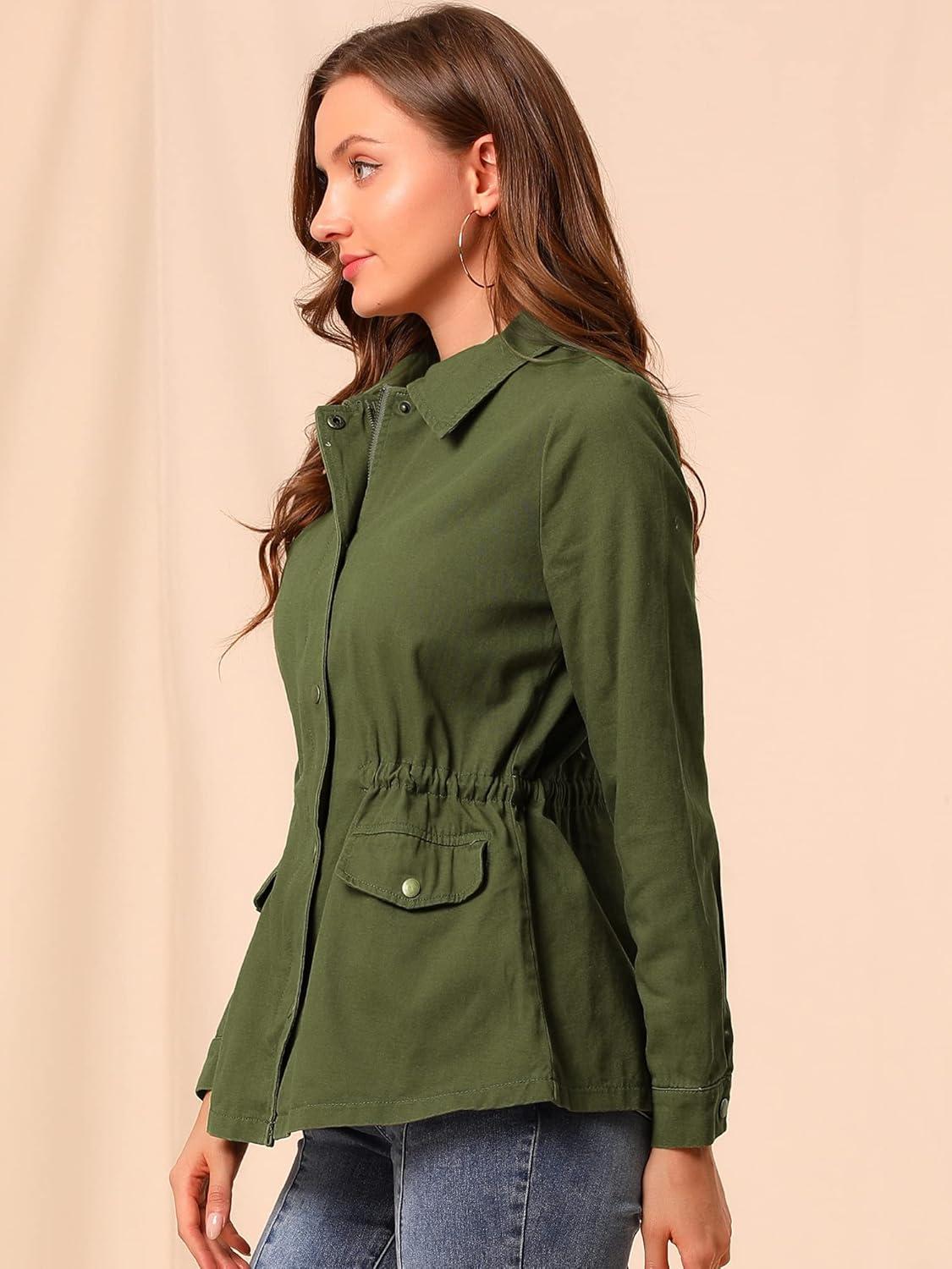 Allegra K Women's Utility Jacket Zip Up Drawstring Waist Snap Buttons Lightweight Anorak Jackets with Pockets(Olive Green)
