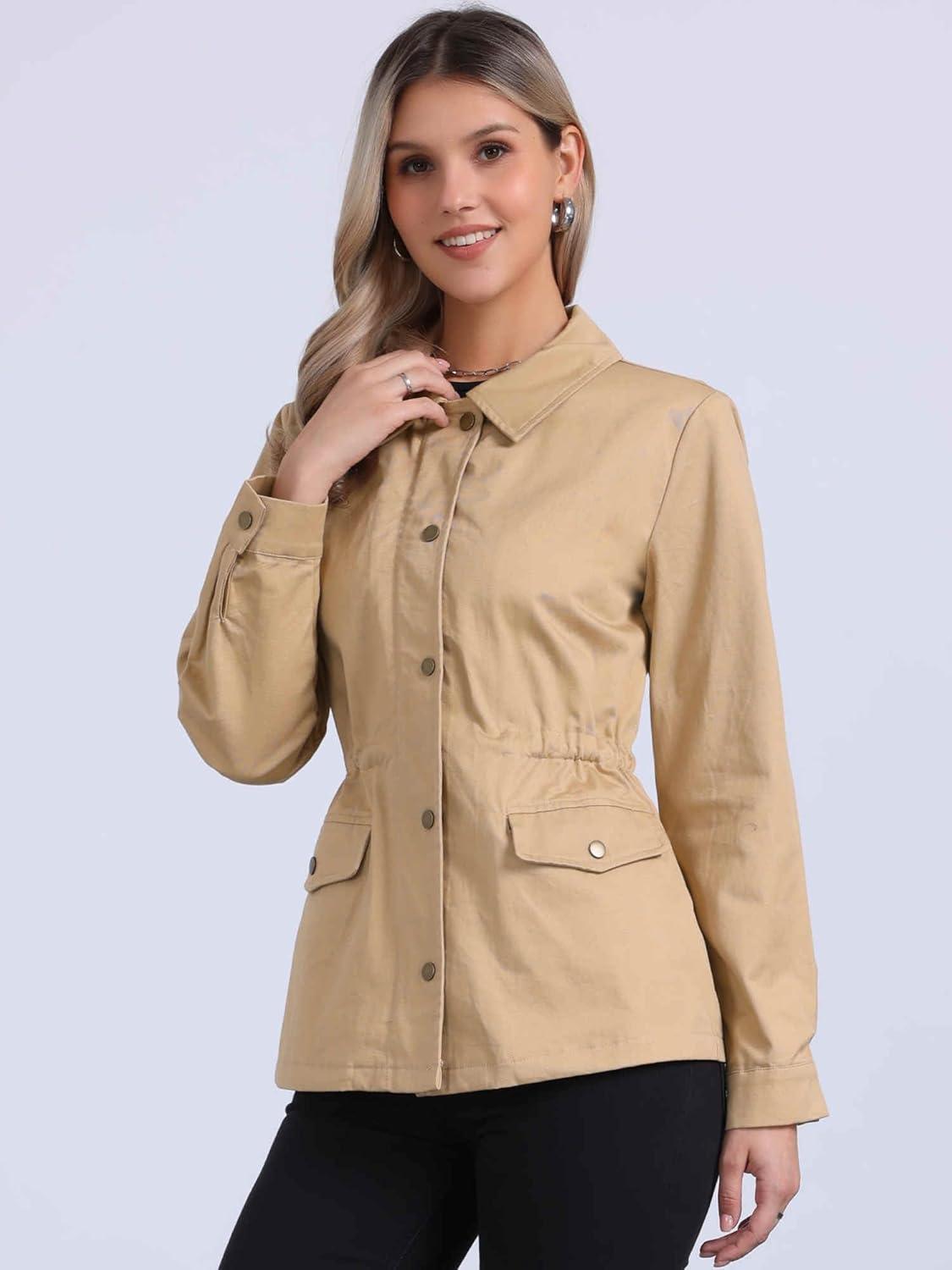 Allegra K Women’s Utility Jacket Zip Up Drawstring Waist Snap Buttons Lightweight Anorak Jackets with Pockets(Tan Khaki)