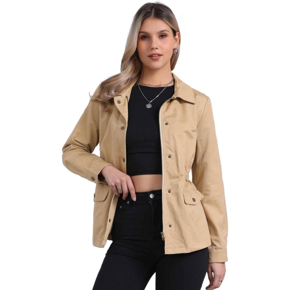 Allegra K Women's Utility Jacket Zip Up Drawstring Waist Snap Buttons Lightweight Anorak Jackets with Pockets(Tan Khaki)