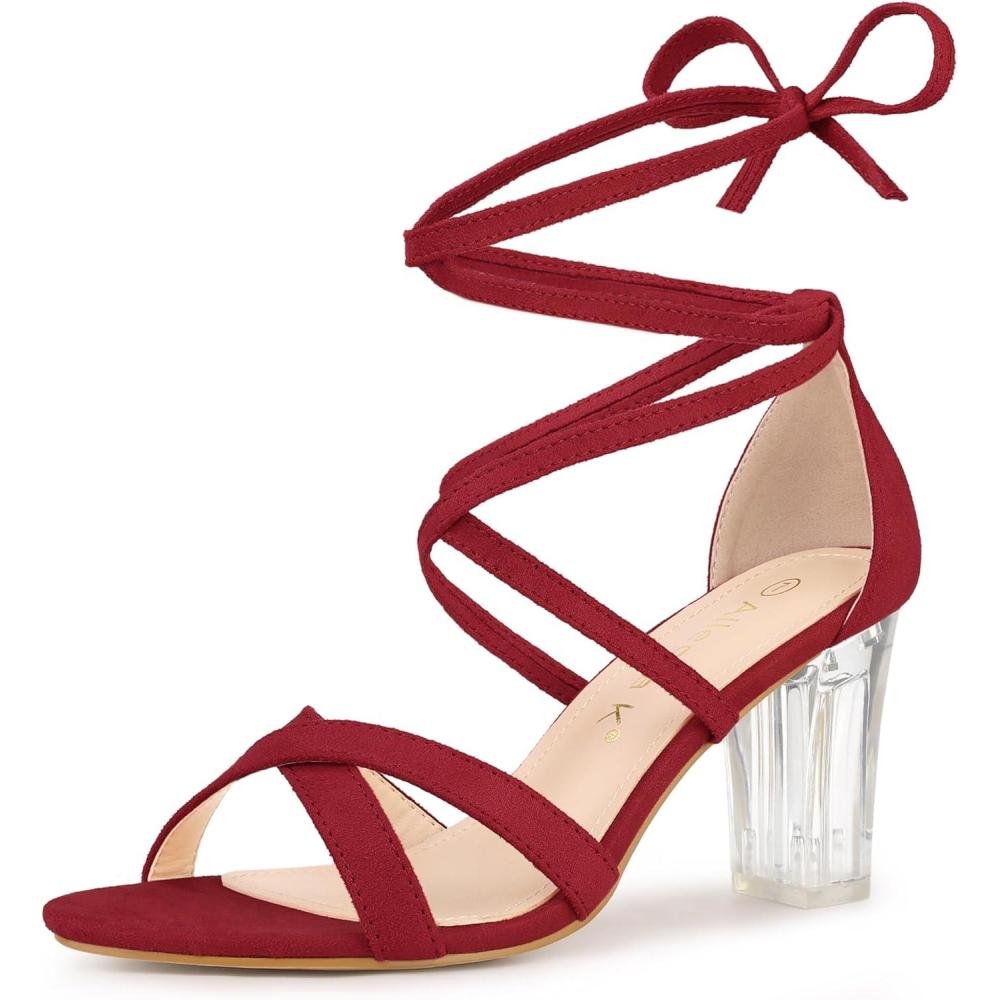 Allegra K Women’s Velvet Lace Up Clear Heels Block Heel Sandals(Red)