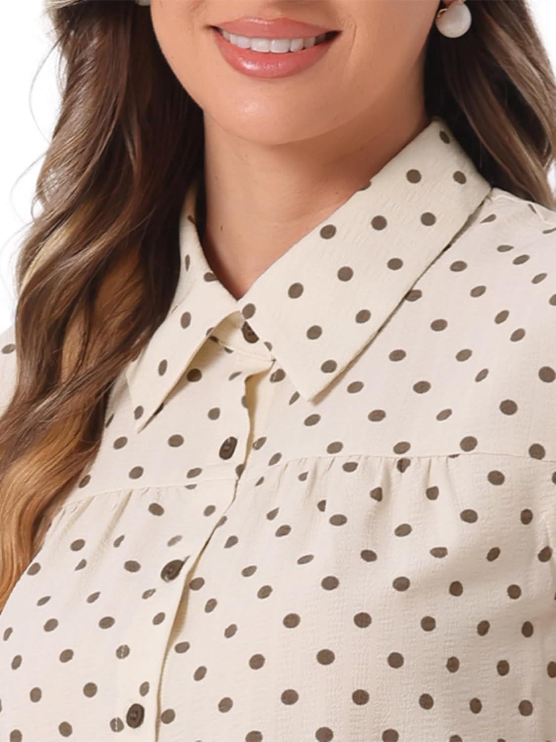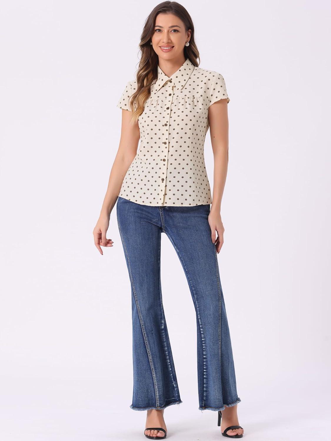 Allegra K Women’s Vintage Polka Dots Shirt Retro Short Sleeve Button Up Tops(Dark Beige)