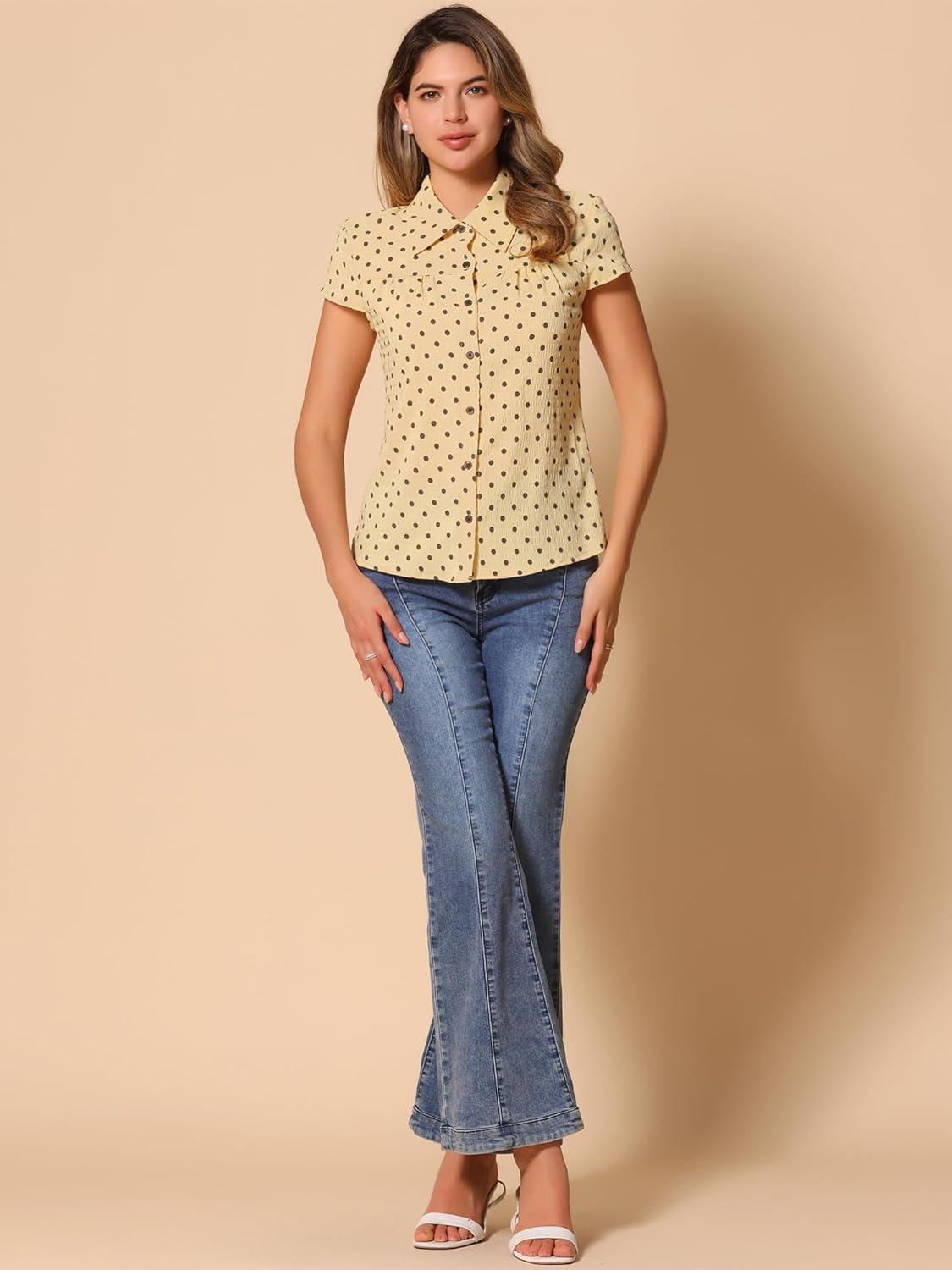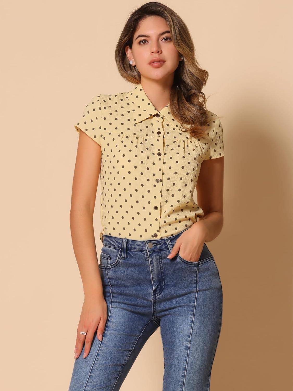 Allegra K Women’s Vintage Polka Dots Shirt Retro Short Sleeve Button Up Tops(Yellow)
