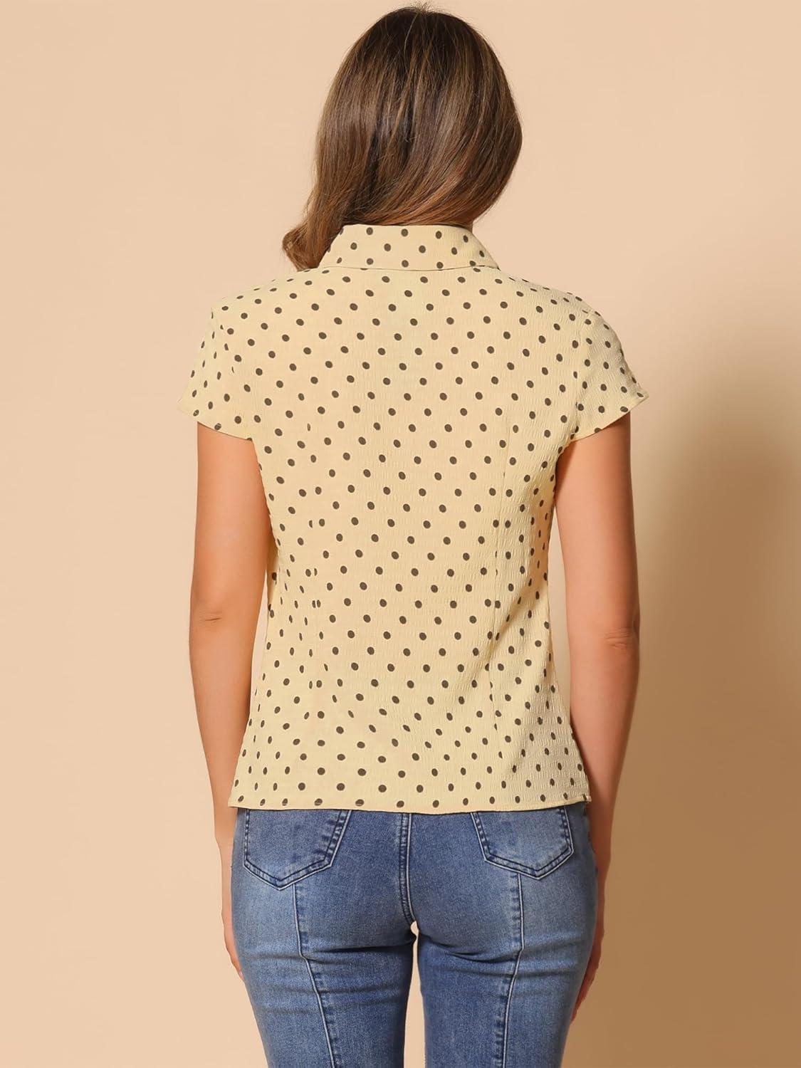 Allegra K Women's Vintage Polka Dots Shirt Retro Short Sleeve Button Up Tops(Yellow Khaki)