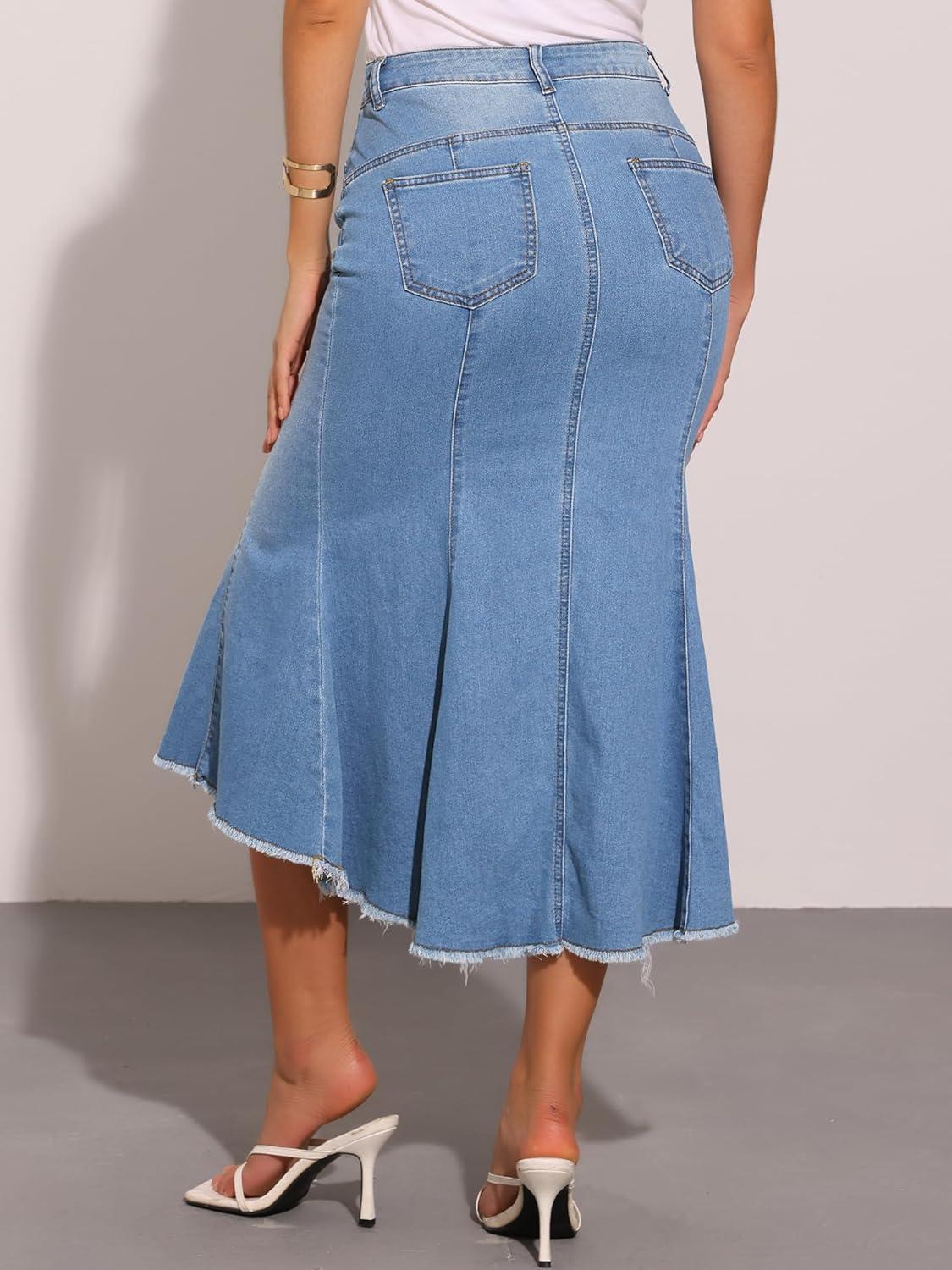 Allegra K Women’s Washed Fishtail Denim Skirt High Waist Raw Hem Fashion Casual Midi Jean Skirts with Pockets(Medium Blue)