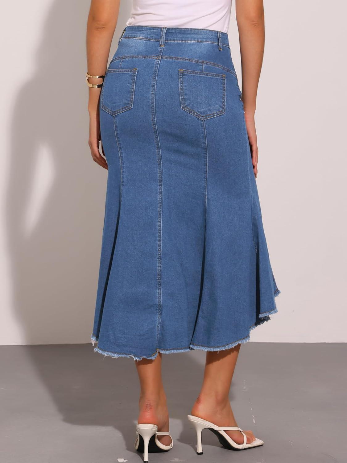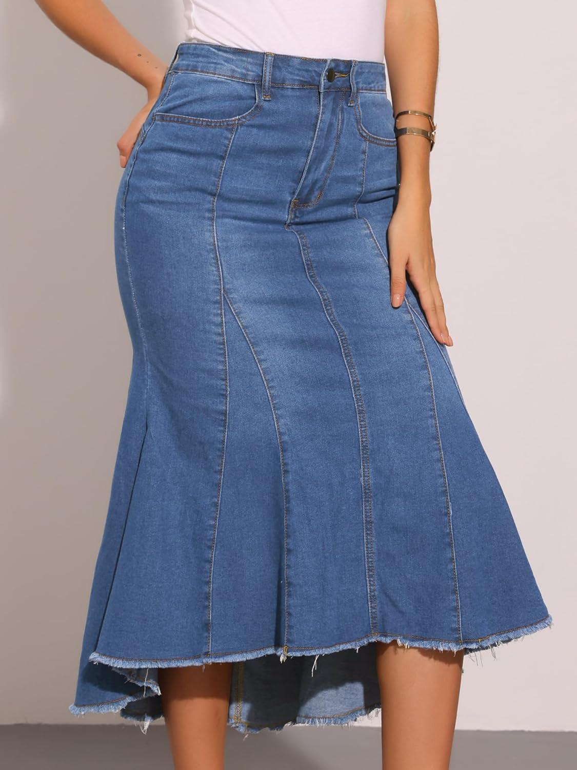 Allegra K Women’s Washed Fishtail Denim Skirt High Waist Raw Hem Fashion Casual Midi Jean Skirts with Pockets(Medium Blue)