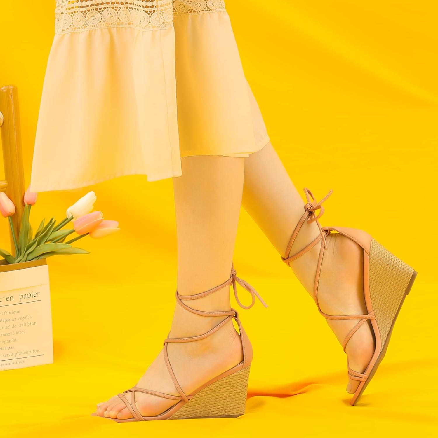 Allegra K Women’s Wedge Heels Lace Up Strappy Low Wedges Sandals(Nude)