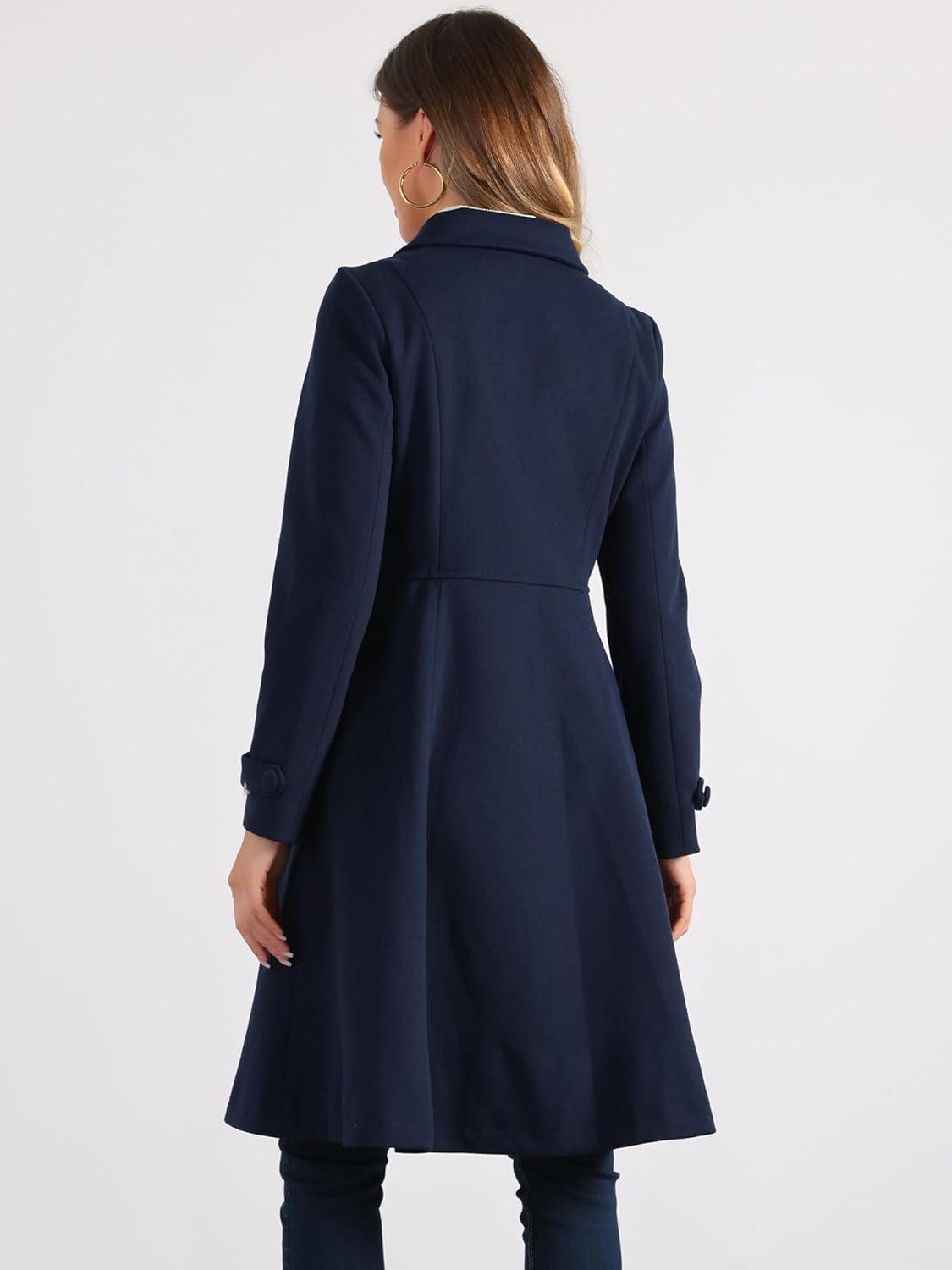 Allegra K Women's Winter Coat Overcoat Lapel Collar Long Swing A Line Double Breasted Pea Coat(Dark Blue)