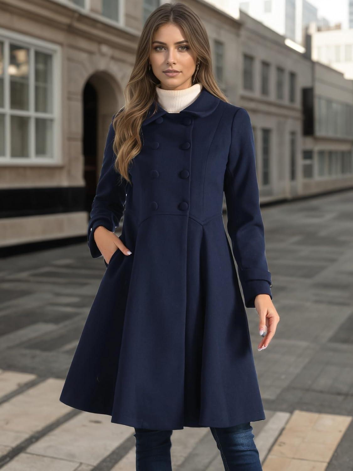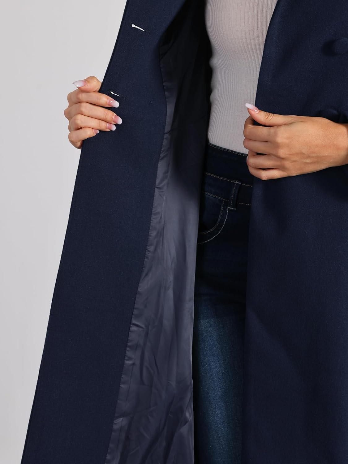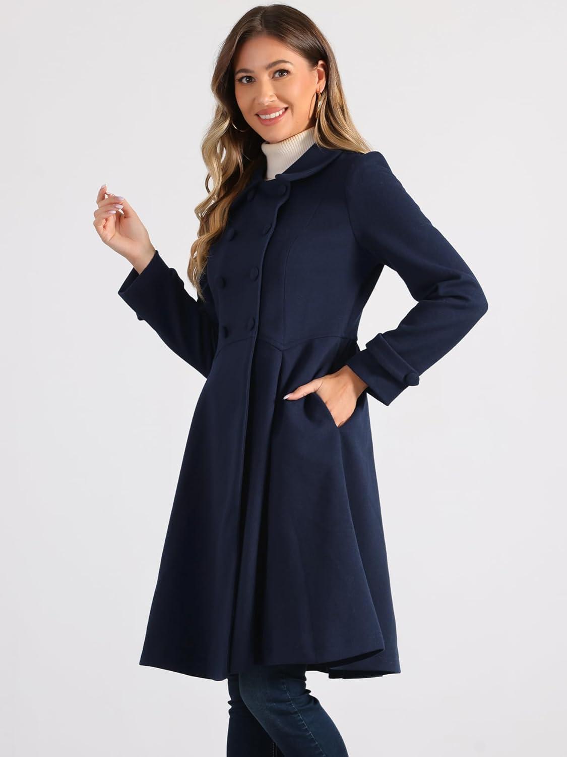 Allegra K Women’s Winter Coat Overcoat Lapel Collar Long Swing A Line Double Breasted Pea Coat(Dark Blue)