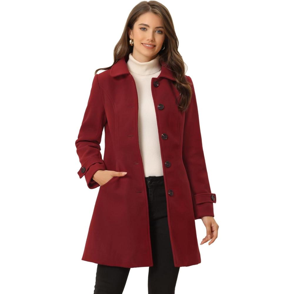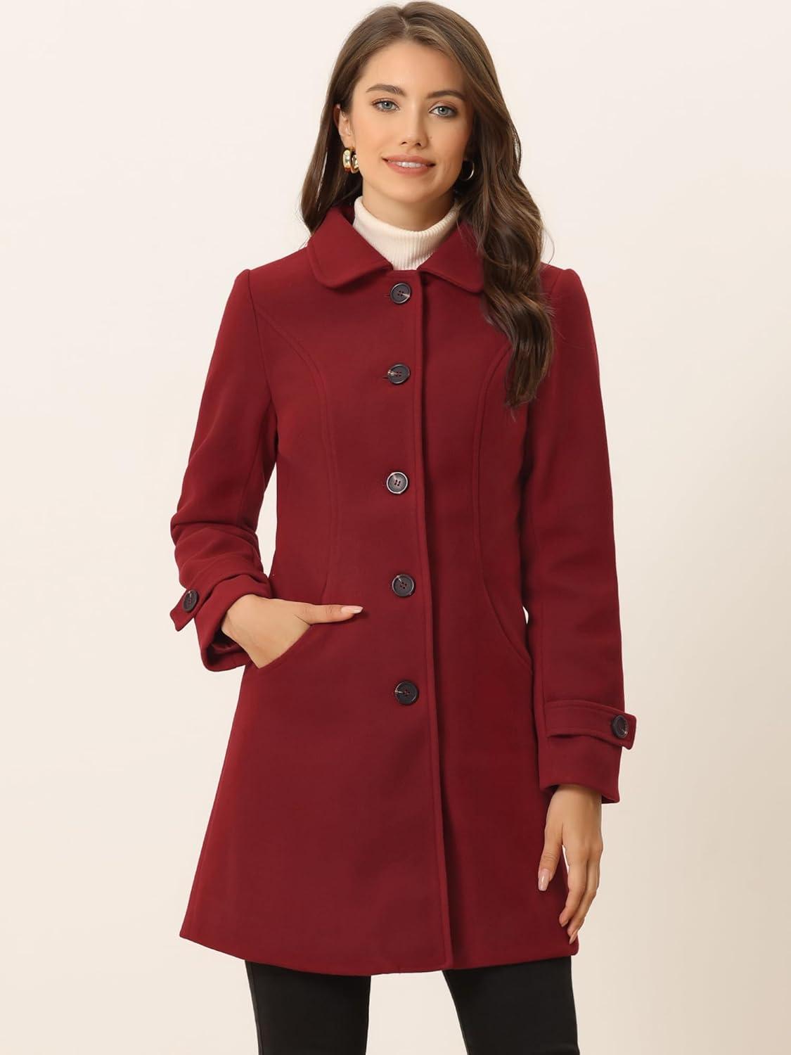 Allegra K Women’s Winter Outerwear Overcoat Peter Pan Collar Mid-thigh A-line Single Breasted Pea Coat(Red)