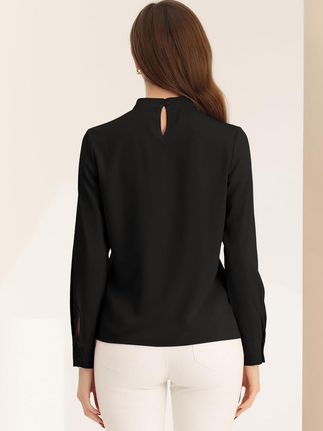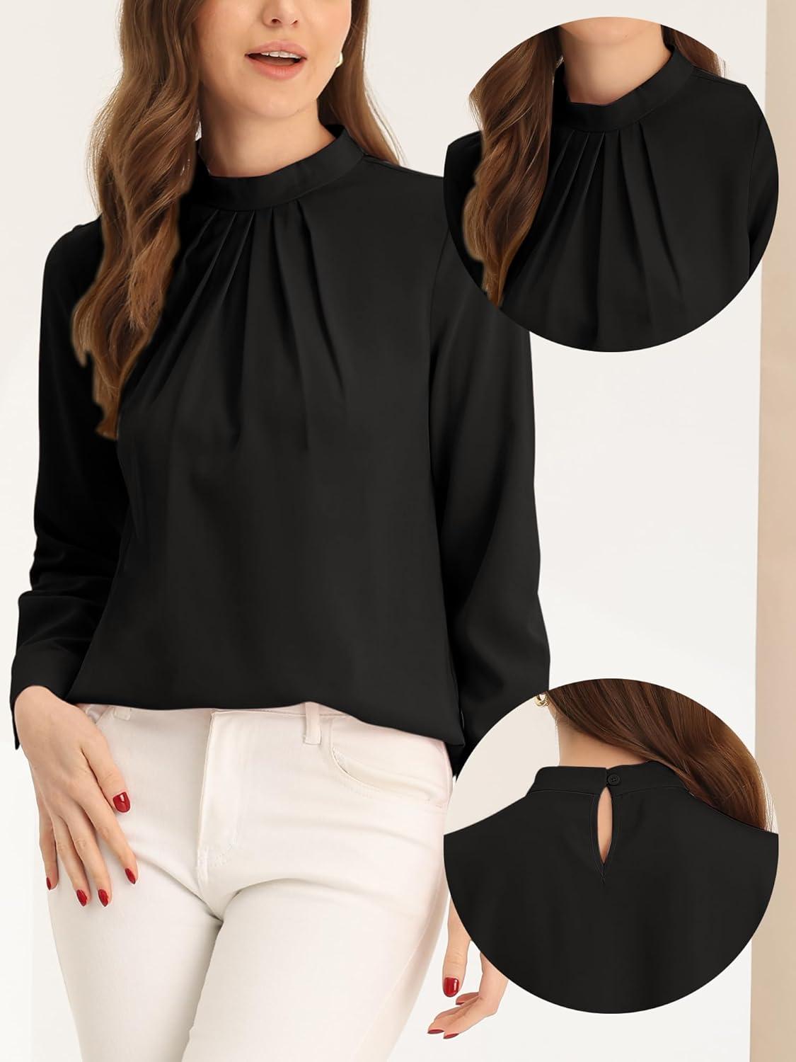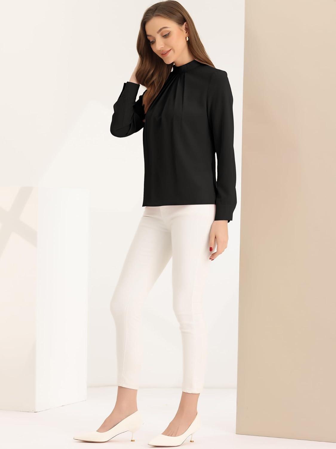 Allegra K Work Blouses for Women Stand Collar Long Sleeve Ruched Dressy Business Casual Work Shirt(Black)